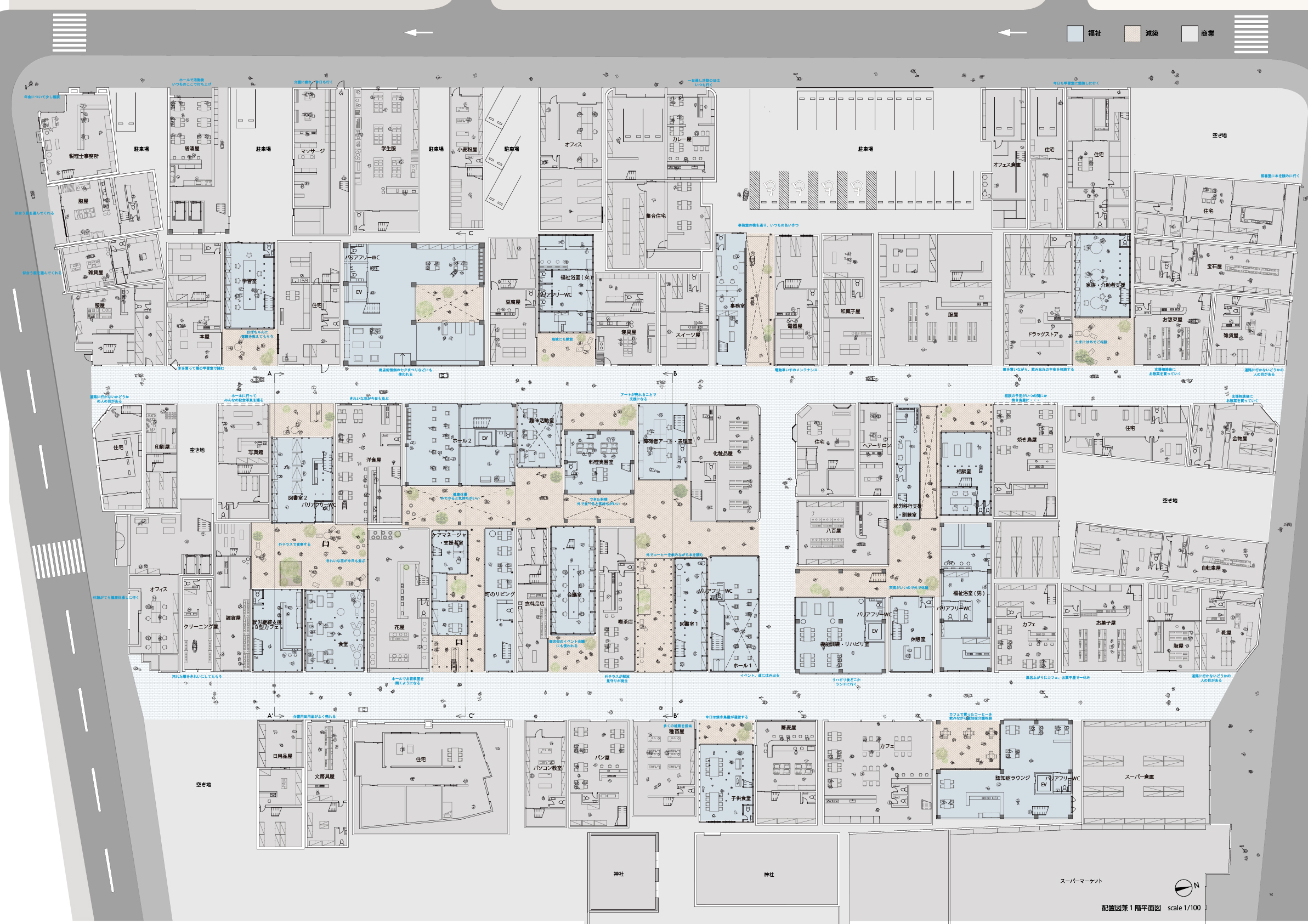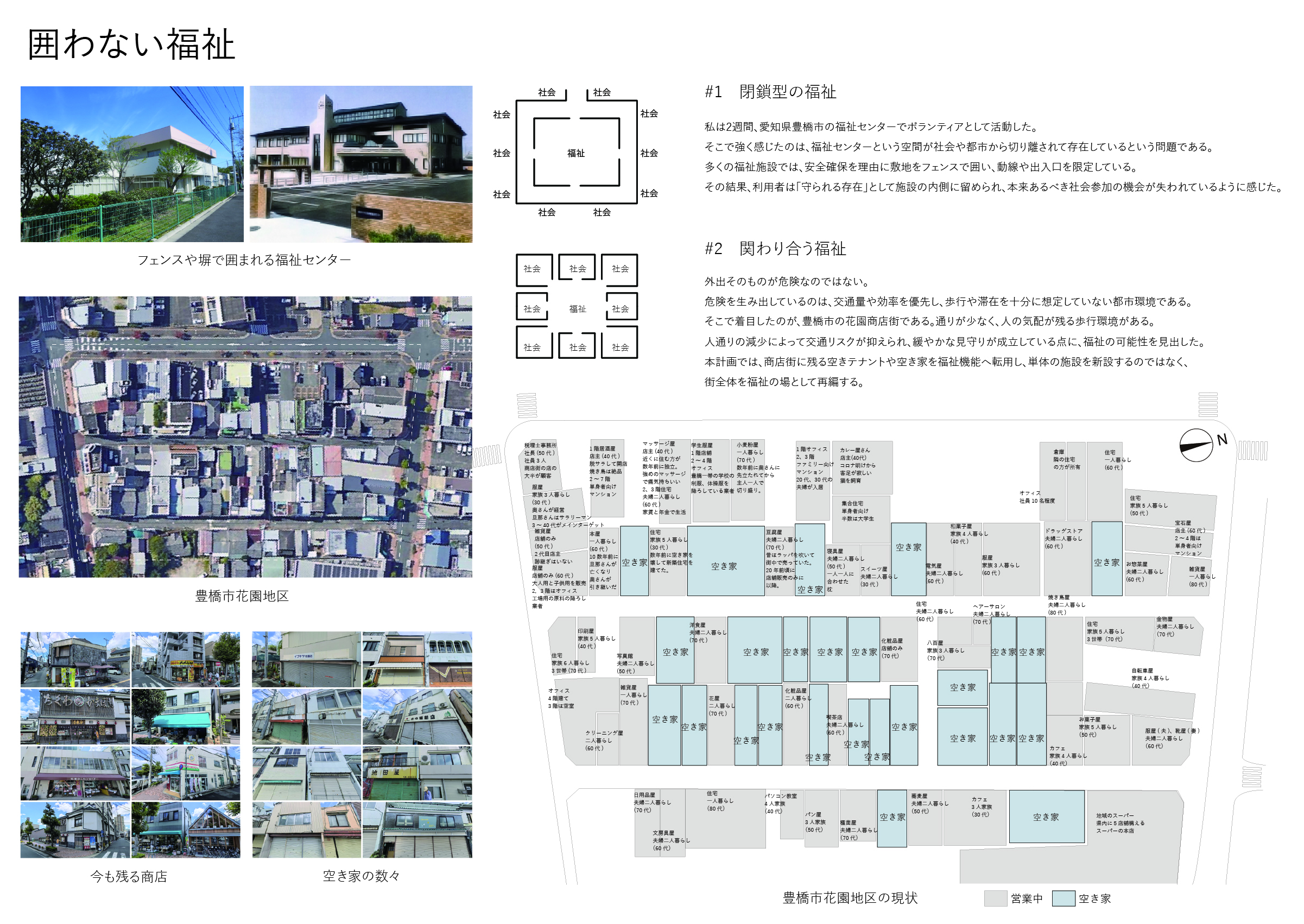 私は2週間、愛知県豊橋市の福祉センターでボランティア活動を行い、福祉施設が社会や都市から切り離されて存在していることに強い違和感を覚えた。多くの施設は安全確保を理由に囲われ、利用者は「守られる存在」として内側に留められている。しかし危険なのは外出そのものではなく、歩行や滞在を想定していない都市環境である。車通りが少なく人の気配が残る花園商店街に福祉の可能性を見出し、本計画では空きテナントや空き家を福祉機能へ転用する。既存建築を減築し余白を生むことで、人と人、人と街が緩やかに関わる環境をつくり、福祉を特別な施設ではなく、都市に埋め込まれた日常の一部として再編する提案である。
