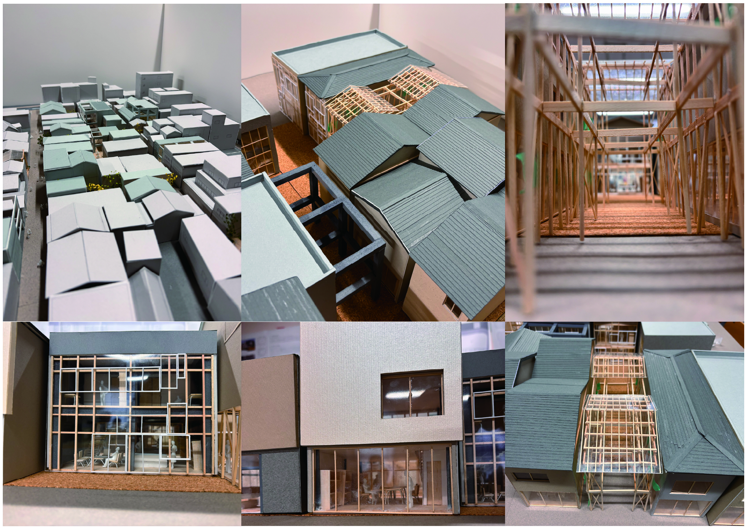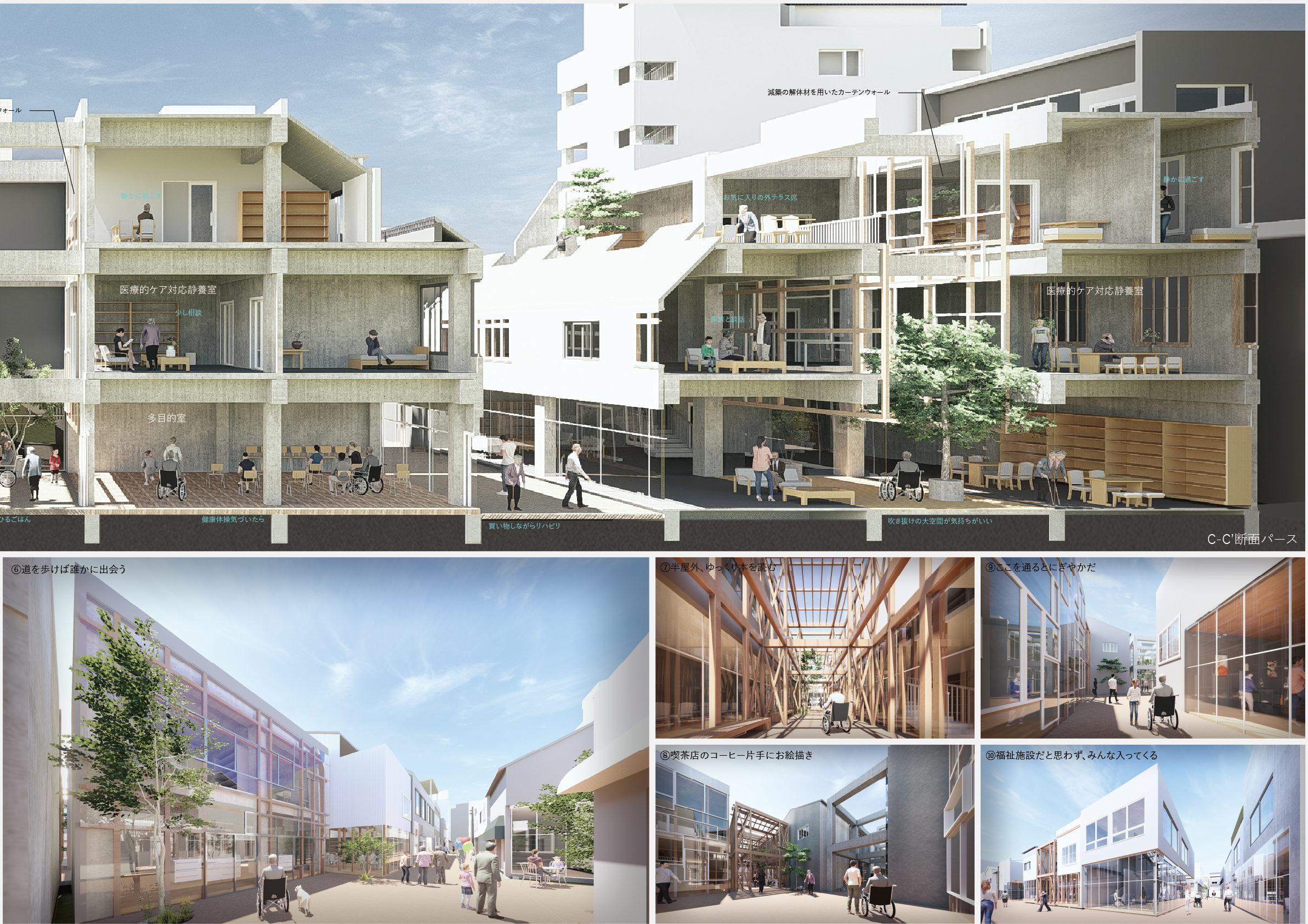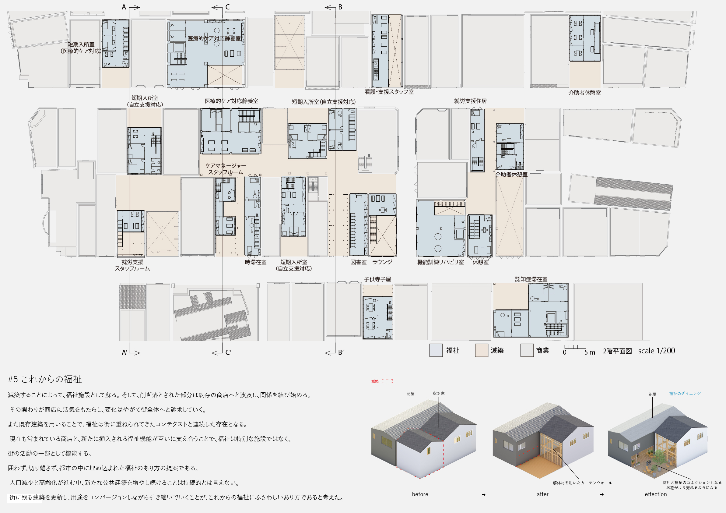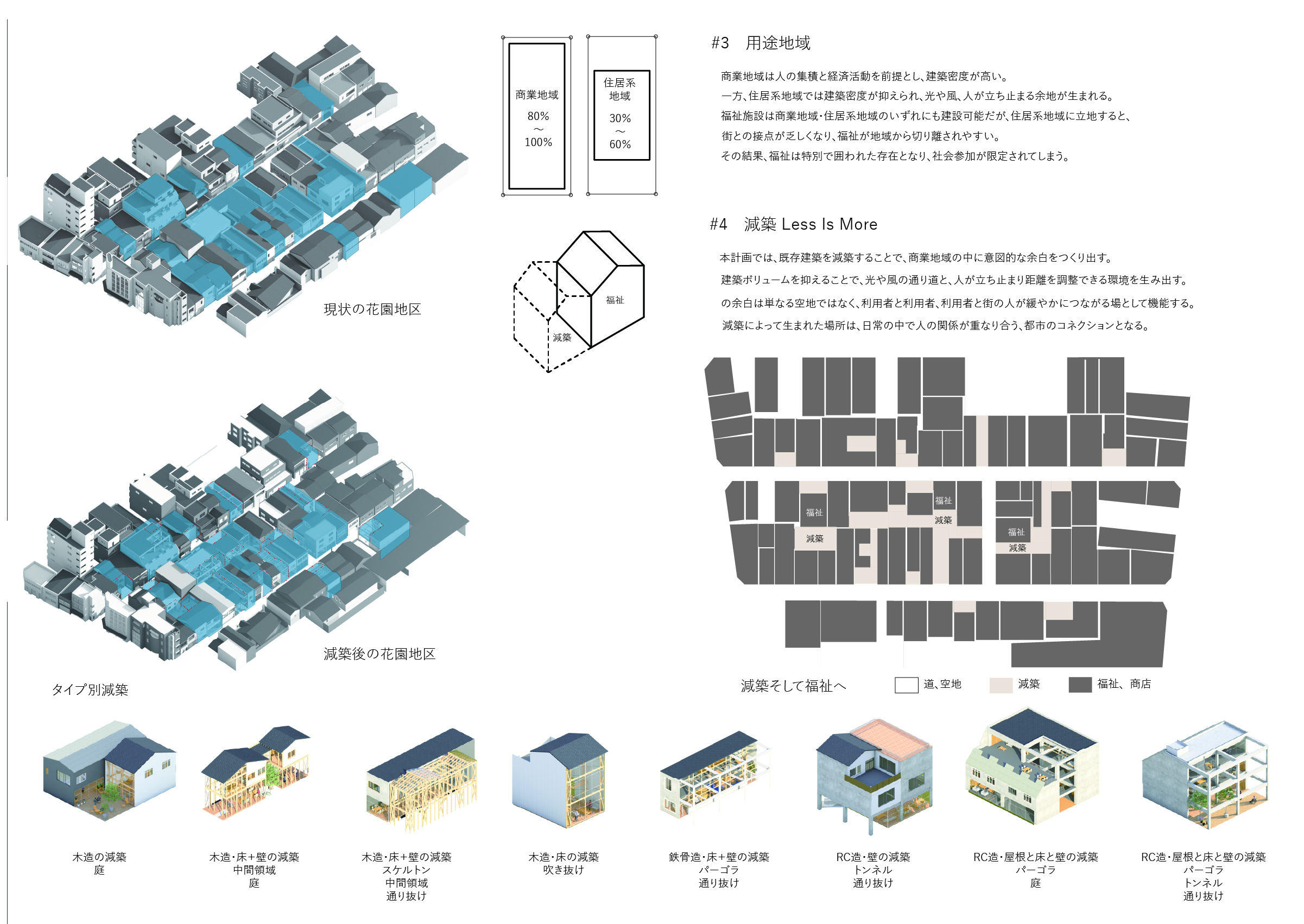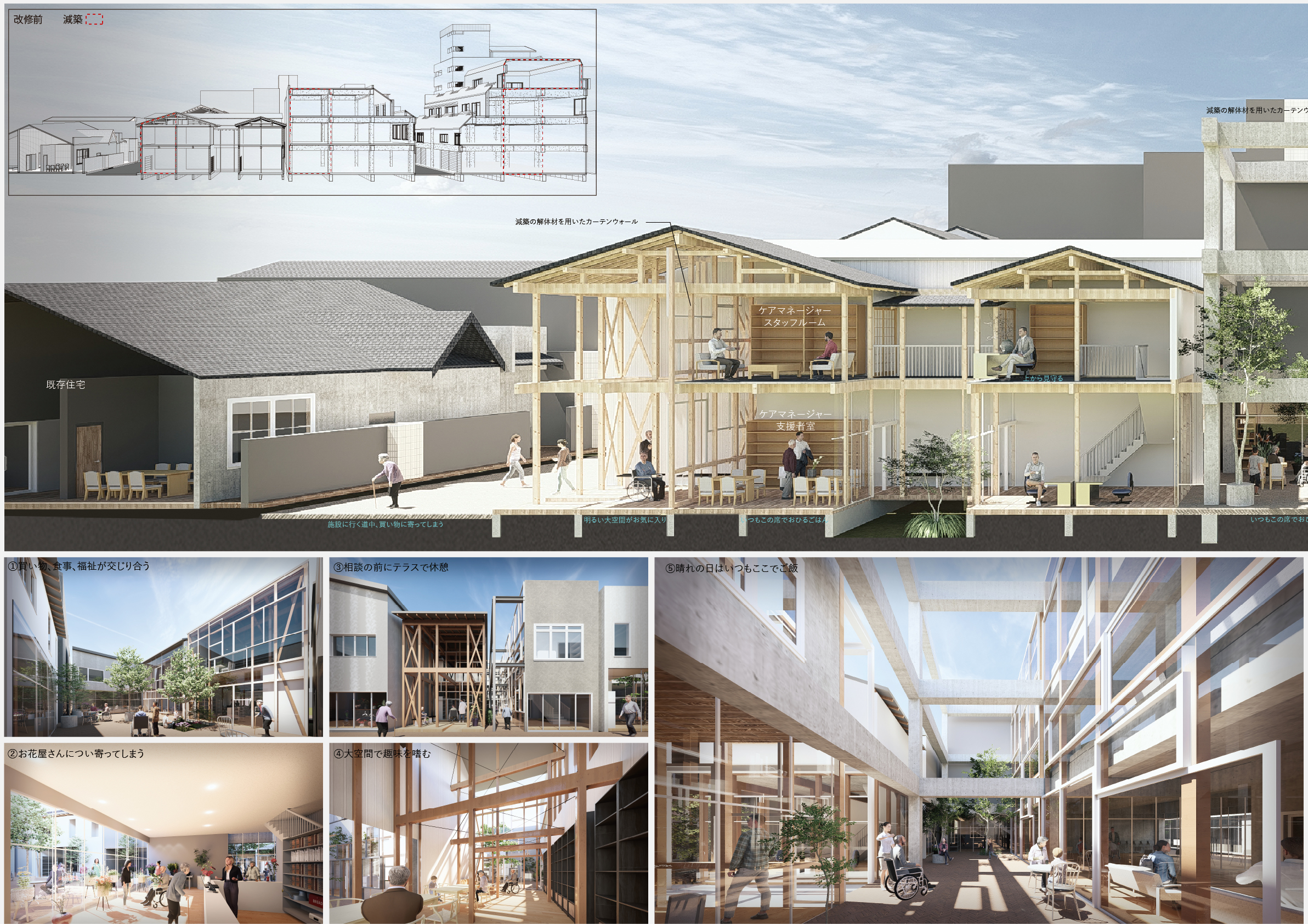 During two weeks of volunteer work at a welfare center in Toyohashi, Aichi Prefecture, I strongly felt that welfare facilities are often spatially and socially isolated from the city. Many are enclosed for safety reasons, positioning users as “protected” and confining them inside. However, the real danger lies not in going outside, but in urban environments that prioritize traffic efficiency over walking and staying. I found potential in Hanazono Shopping Street, where low traffic and lingering human presence enable gentle forms of mutual watching. This project reuses vacant shops and houses as welfare functions, restructuring the entire street as a welfare environment. By subtracting existing buildings to create spatial margins, the proposal fosters loose relationships between people and the city, embedding welfare into everyday urban life rather than treating it as a special facility.