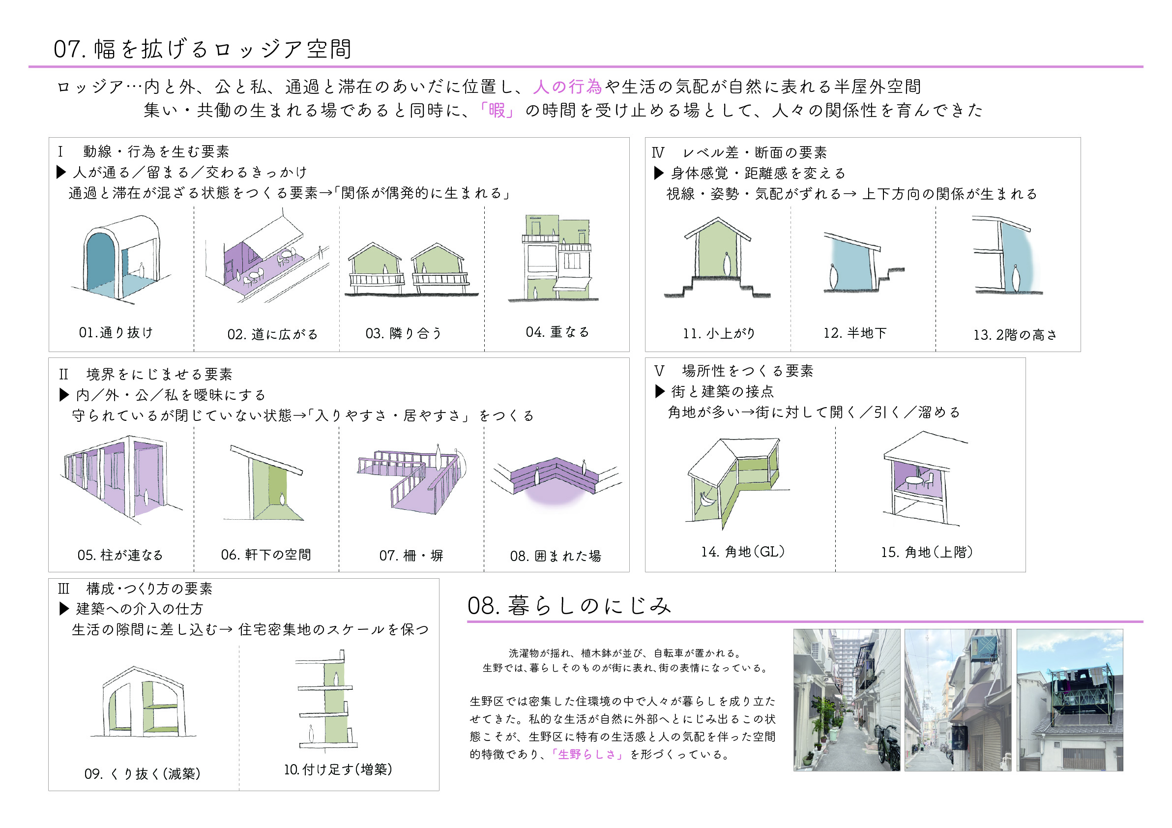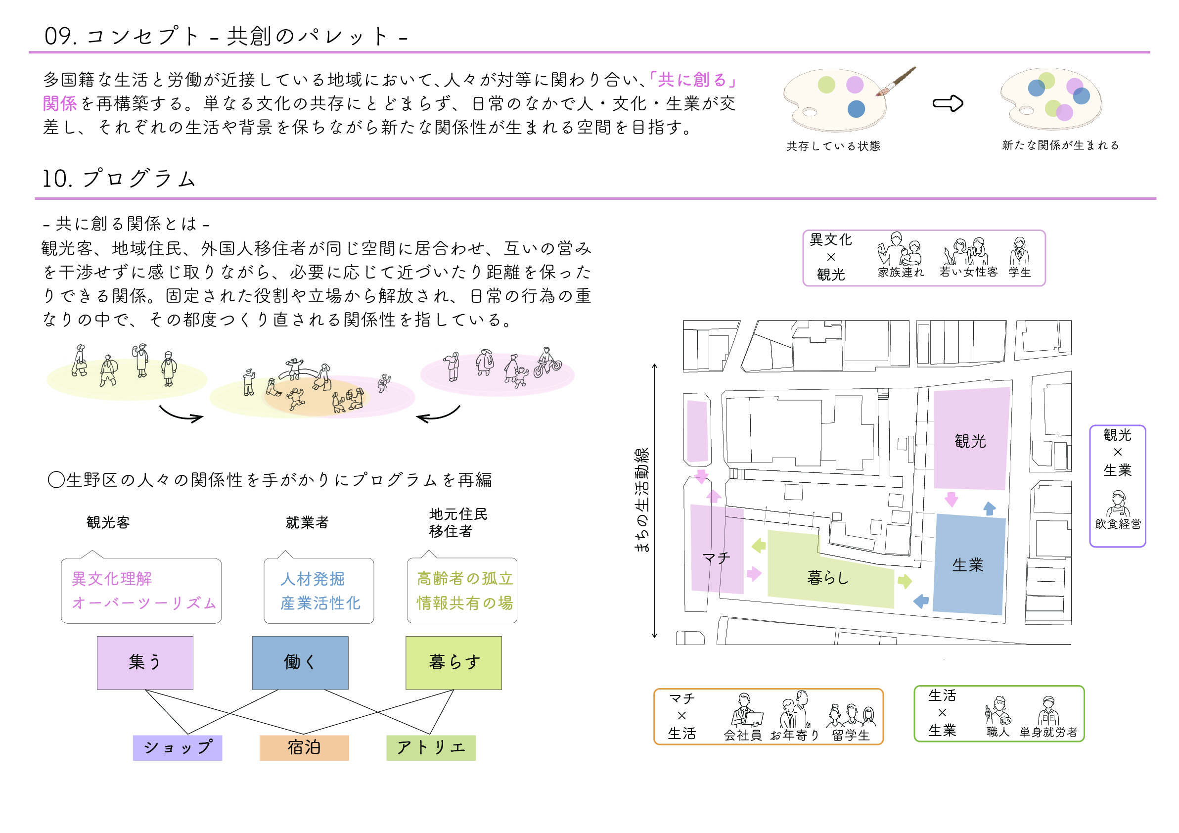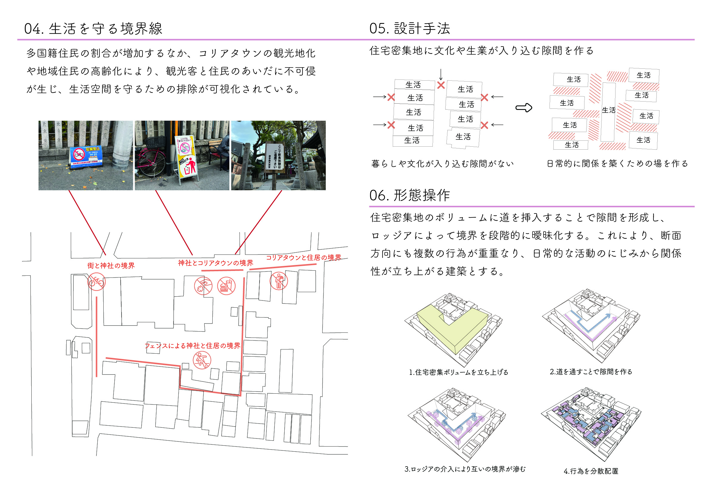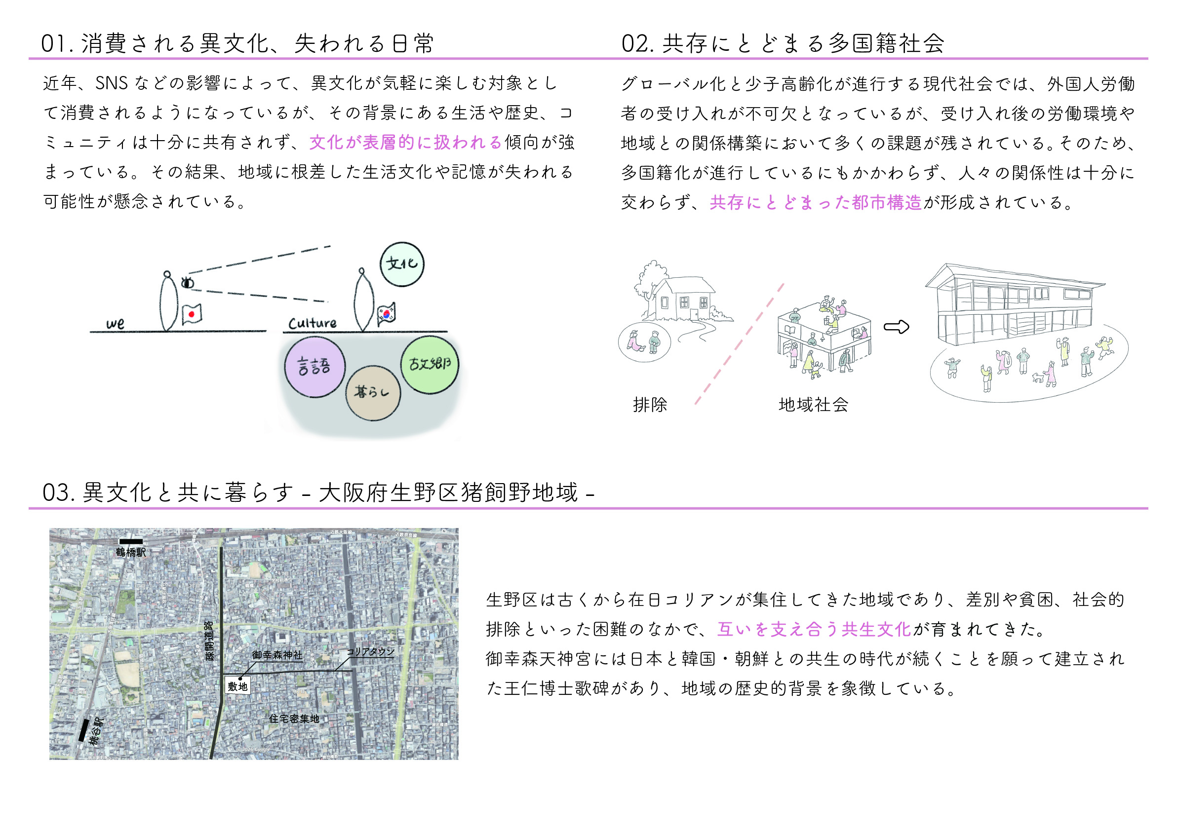 多国籍な生活と労働が近接する地域では、異なる文化や背景をもつ人々が共に暮らしている一方で、関係性は十分に交わらず、共存にとどまっている。本設計は、生野区に見られる生活や生業のあふれ出しに着目し、人々が対等に関わり合い、「共に創る」関係を再構築することを目的とする。内と外、公と私、通過と滞在の境界をにじませるロッジアを介して、日常の行為や時間が重なり合う空間をつくることで、人・文化・生業が交差し、それぞれの生活や背景を保ちながら、新たな関係性が育まれる建築を目指す。