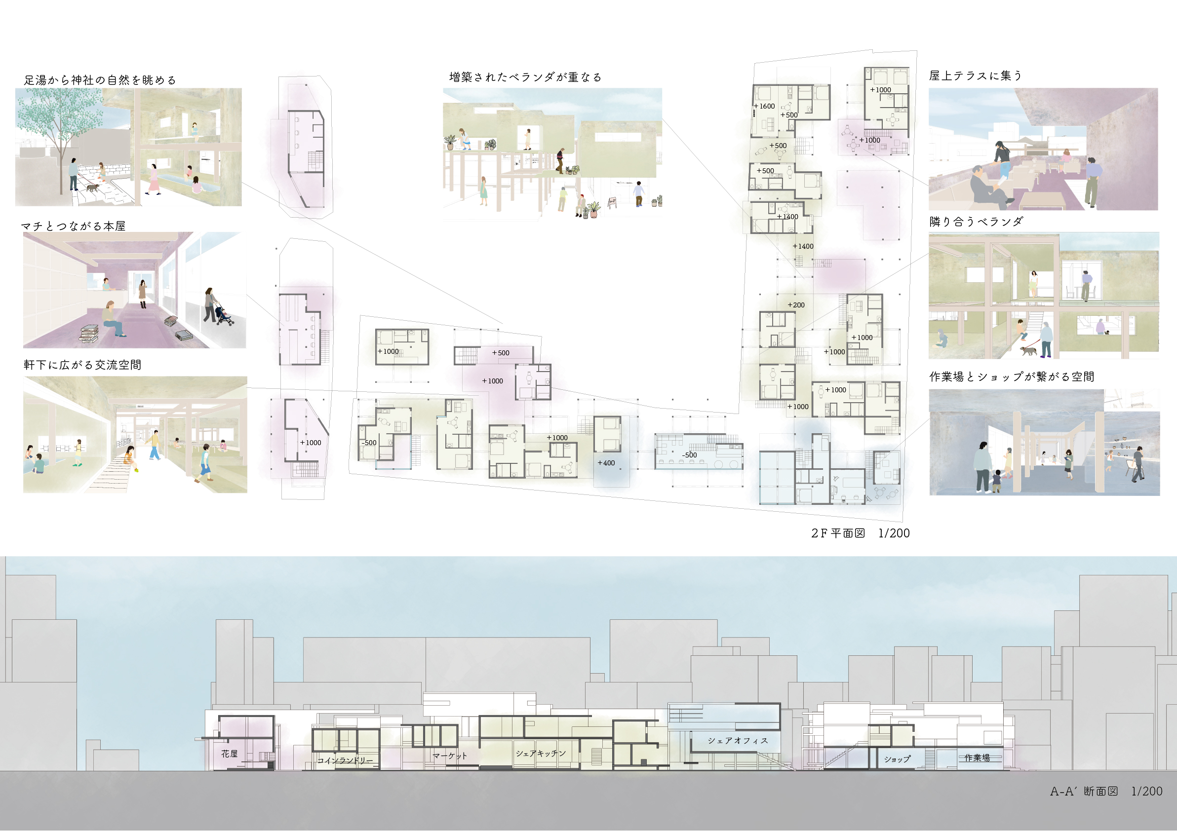 In areas where multinational life and work are in close proximity, people of different cultures and backgrounds live side by side, but their relationships do not fully intersect and remain at a coexistence level. This design focuses on the overflow of lifestyles and livelihoods seen in Ikuno Ward, with the aim of rebuilding relationships in which people interact as equals and "create together." By creating a space where everyday actions and time overlap through a loggia that blurs the boundaries between inside and outside, public and private, and passing and staying, we aim to create an architecture where people, cultures, and livelihoods intersect and new relationships are nurtured while maintaining each individual's lifestyle and background.