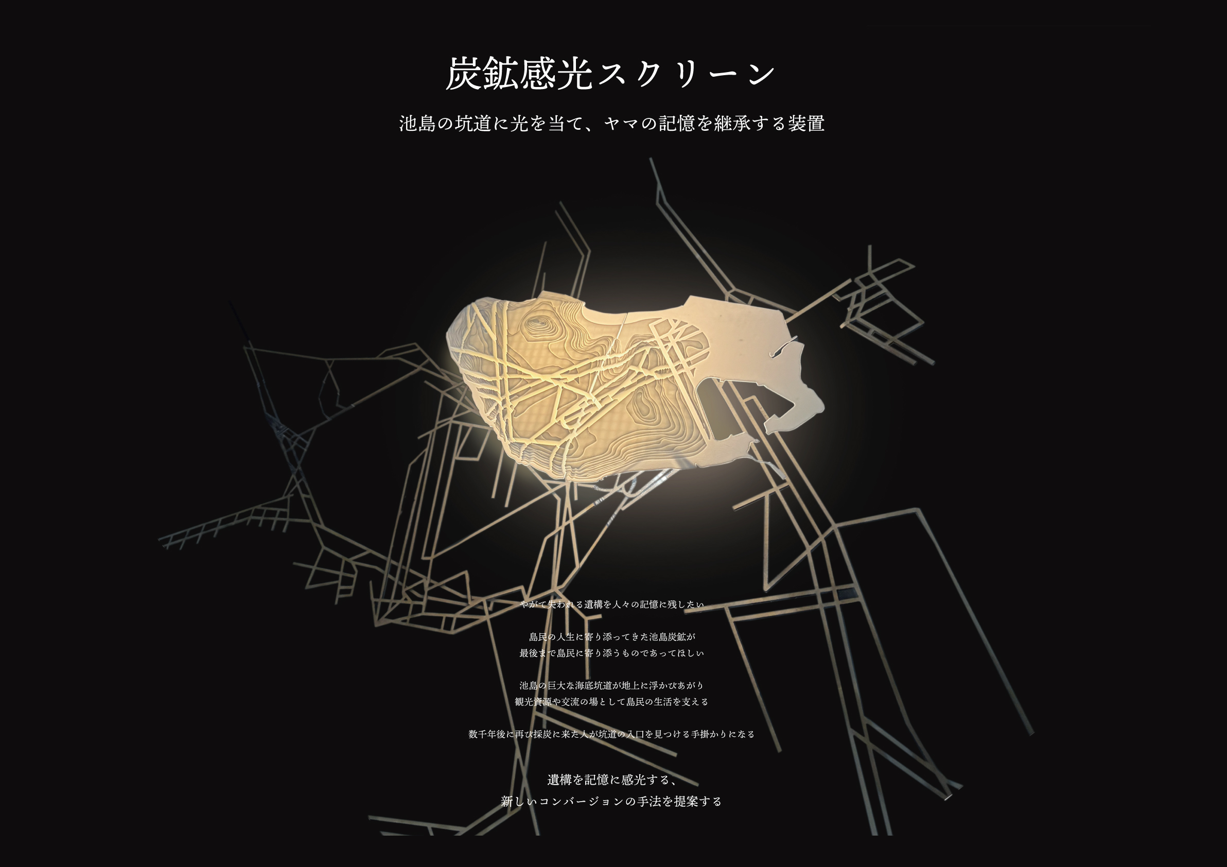 炭鉱感光スクリーン -池島の坑道に光を当て、ヤマの記憶を継承する装置- Coal canyon, photon, screen.
