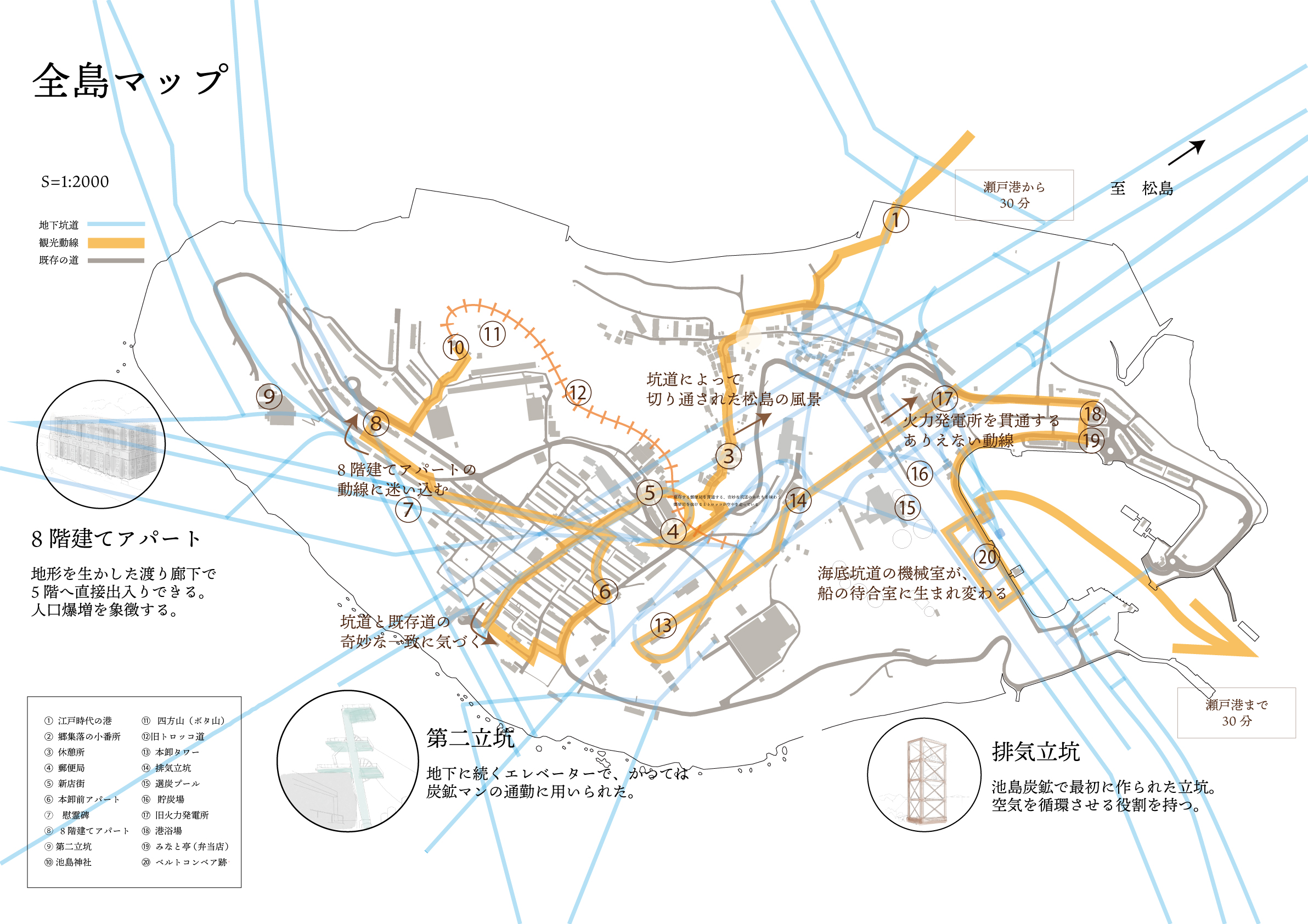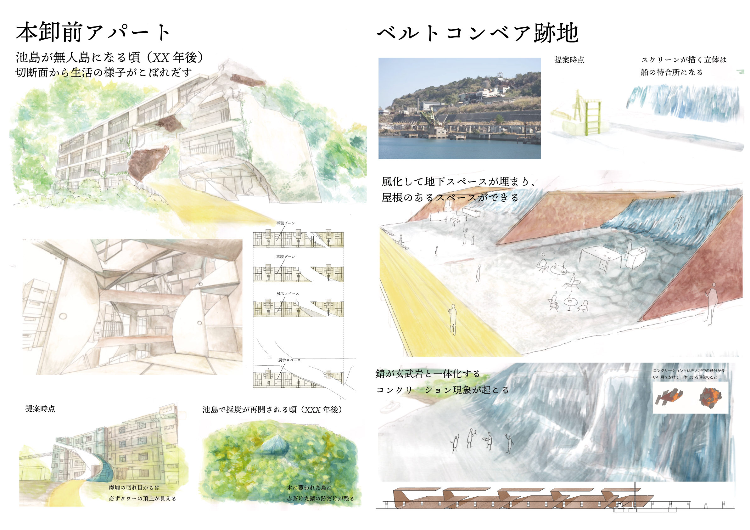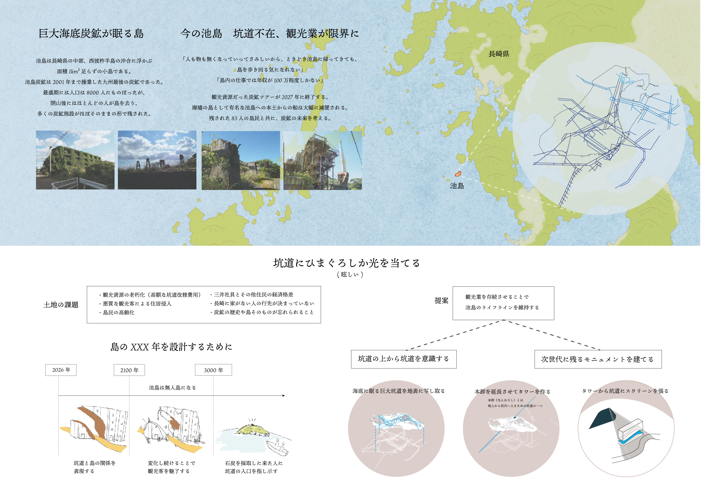長崎県の西に位置する池島は面積0.68㎢の小島で、かつては日本有数の良質な石炭の産地であり、今でも巨大な海底炭鉱を有している。最盛期に8000人に上った人口は、83人にまで減少し、既存の坑道を利用した炭鉱ツアーは、設備の老朽化のため来年度末に終了する。一方、医療やスーパーマーケットなどのライフラインが失われつつあるが、地元への思い入れや経済的な背景から池島に残る島民がいる。残された島民が島で余生を送ることはできないだろうか。本設計では、海底に縦横無尽に広がる坑道のラインを池島全体に浮かび上がらせ、既存の道と地下坑道を縫うような観光動線を進むことによって、池島の歴史や記憶を鮮烈に印象付けるフォリー群を提案する。フォリーは観光客と島民のための居場所として機能したのちに、再び石炭を掘りに来た人々を受け入れる。池島の遠い過去と未来を結び付けて人々をじっと見守る空間を提案する。