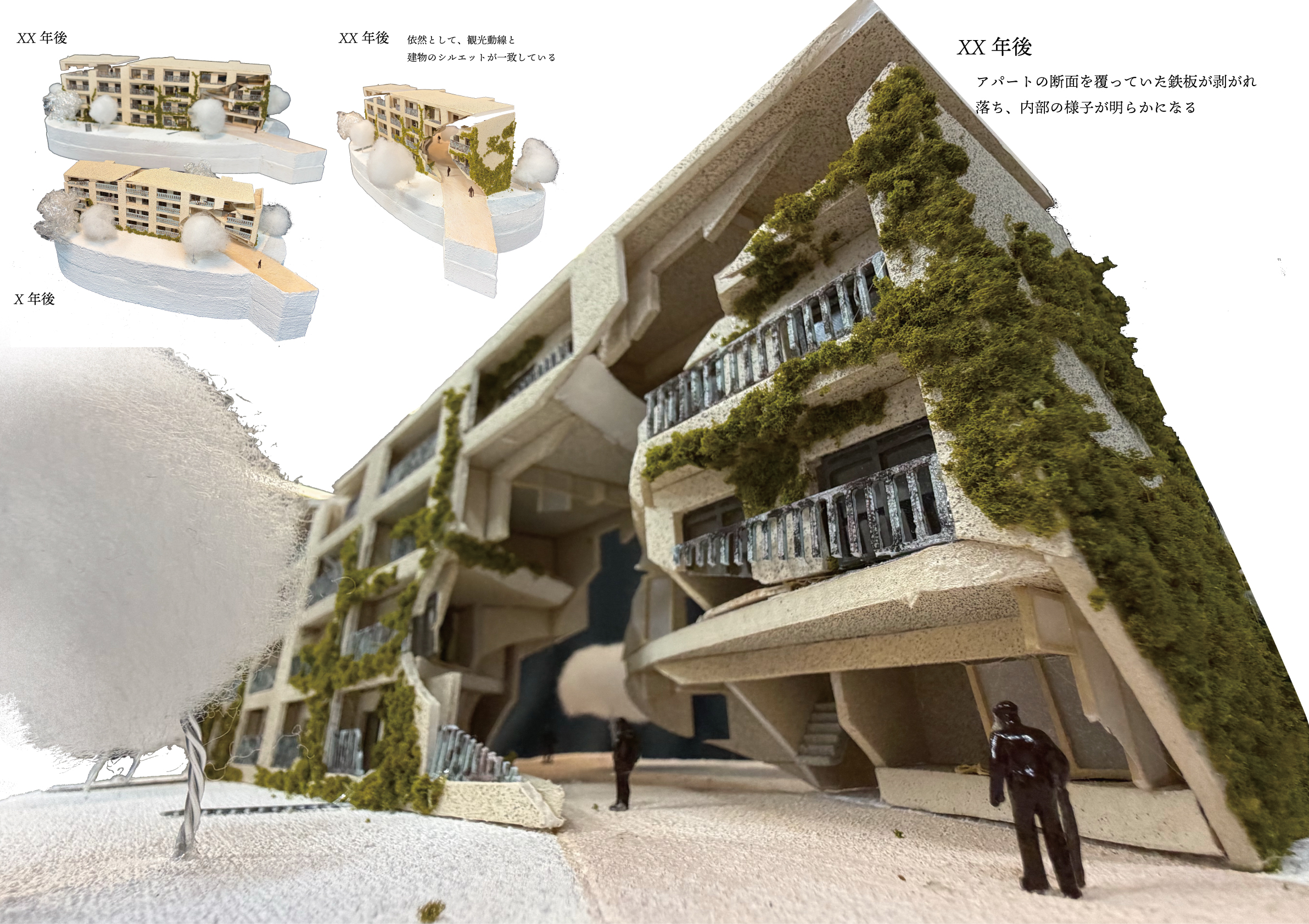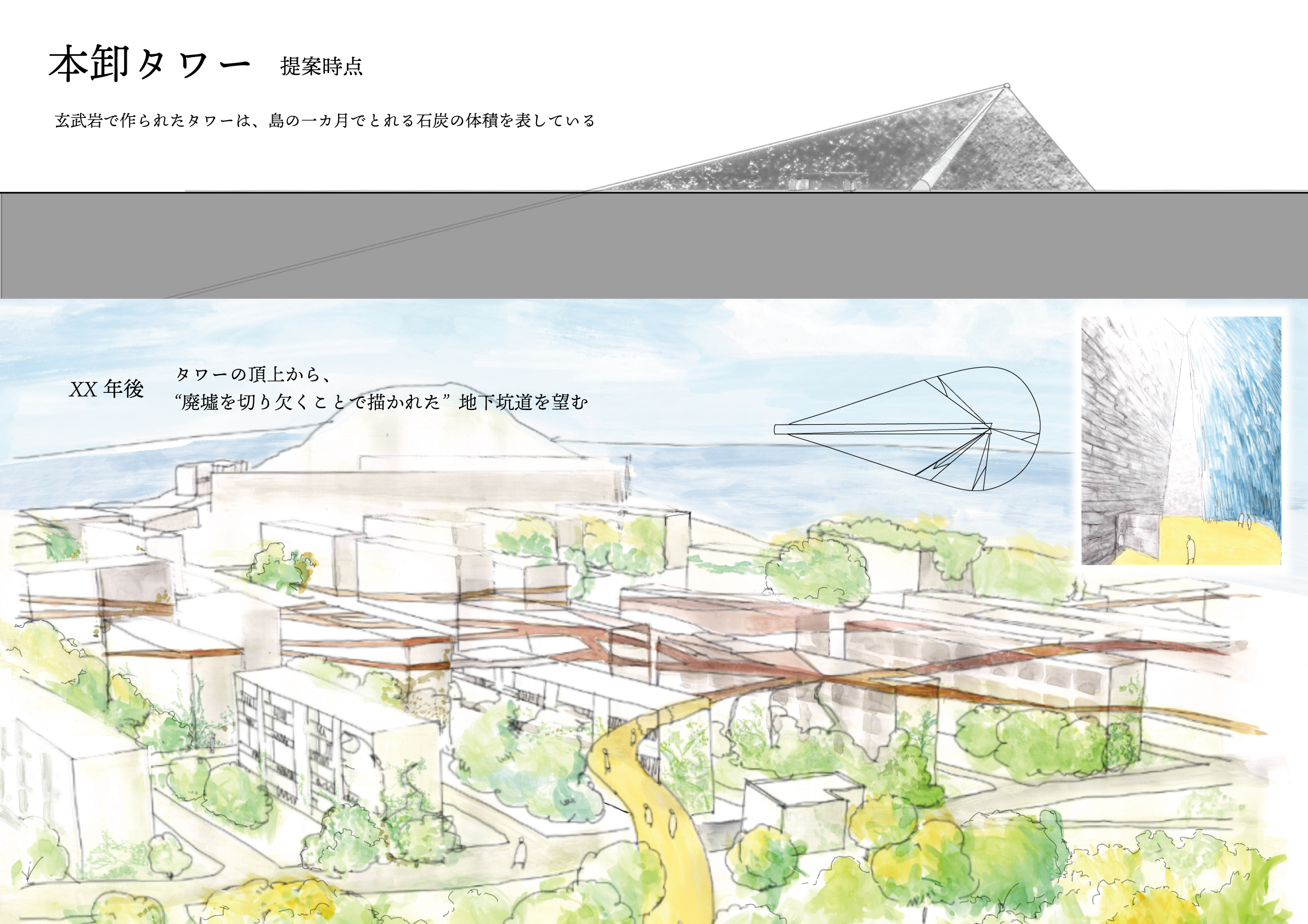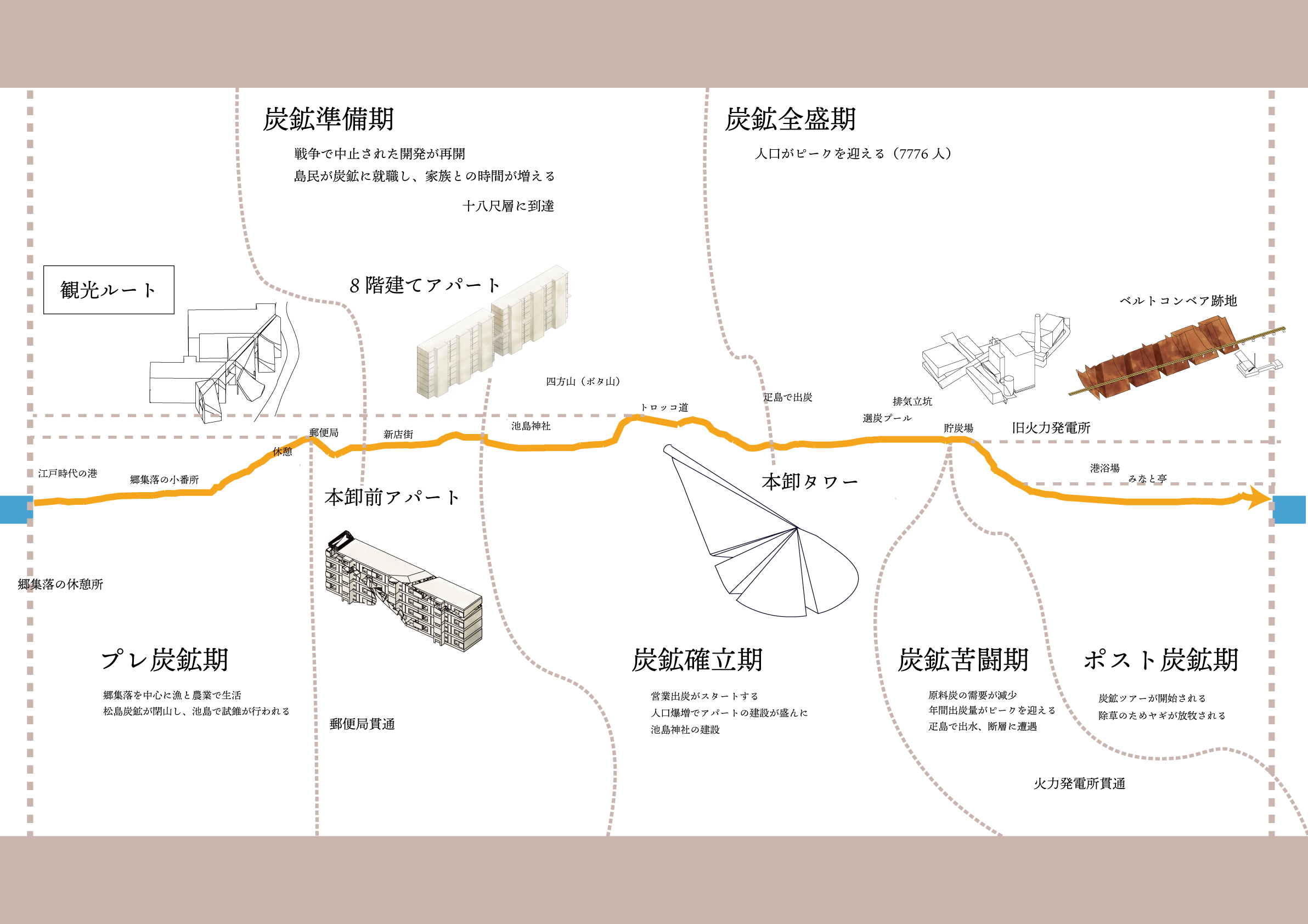 Located west of Nagasaki, Ikeshima is a small island once thriving as a premier coal source. Its population has plummeted from 8,000 to just 83. While essential services vanish, some residents remain out of local devotion. This design proposes a series of follies that trace the vast undersea tunnels, creating a path to preserve the island's memory. These structures serve both tourists and locals, eventually welcoming future miners.
