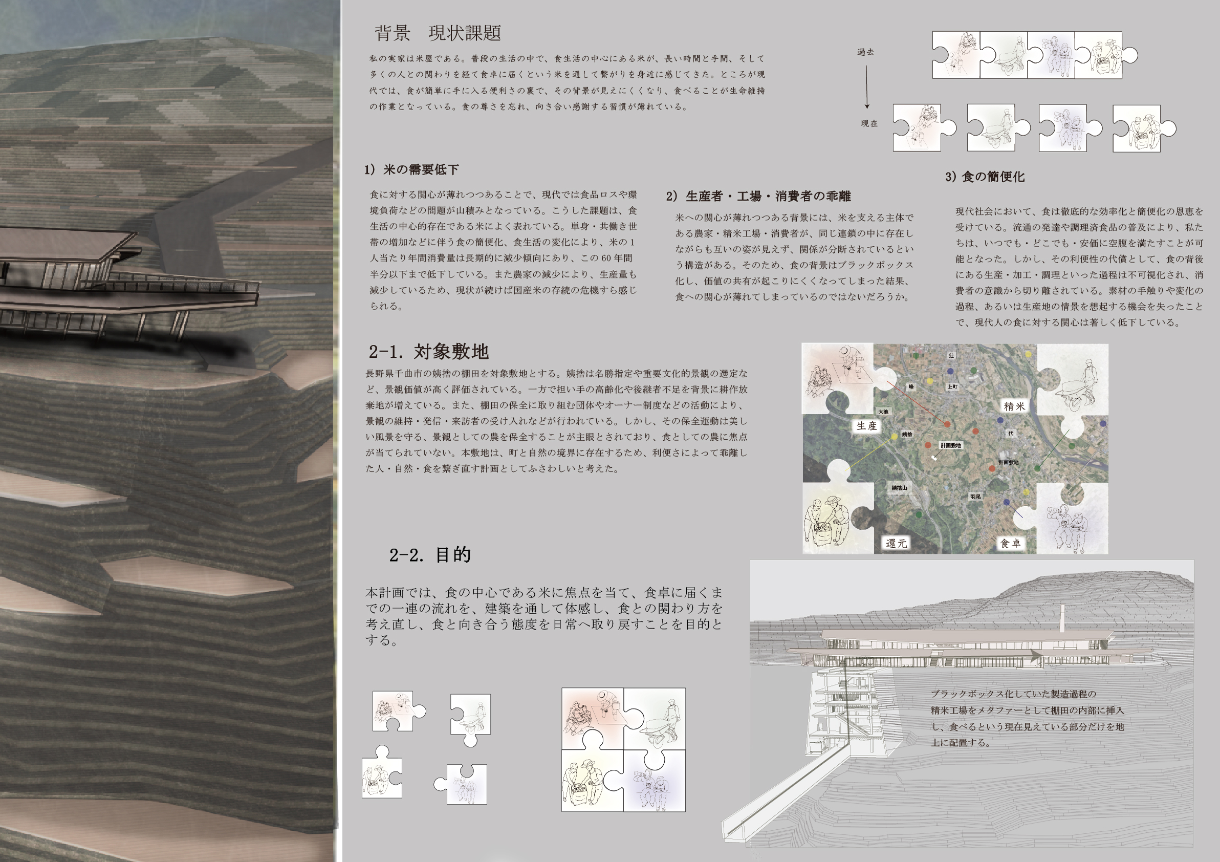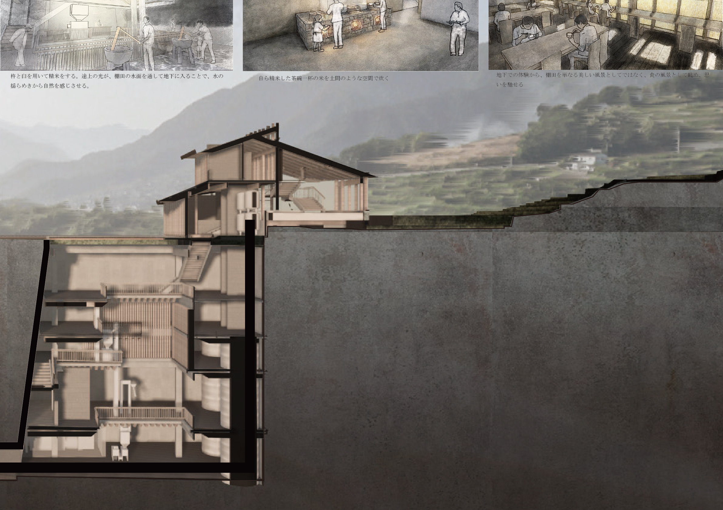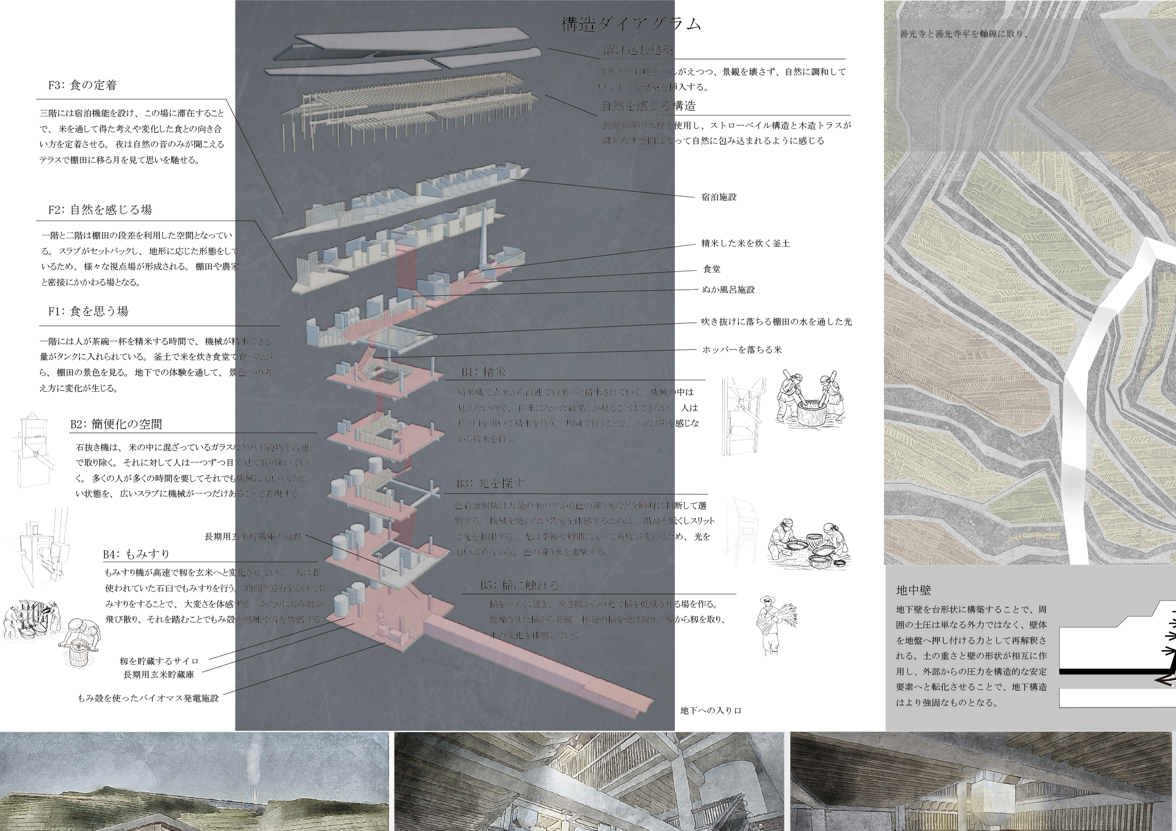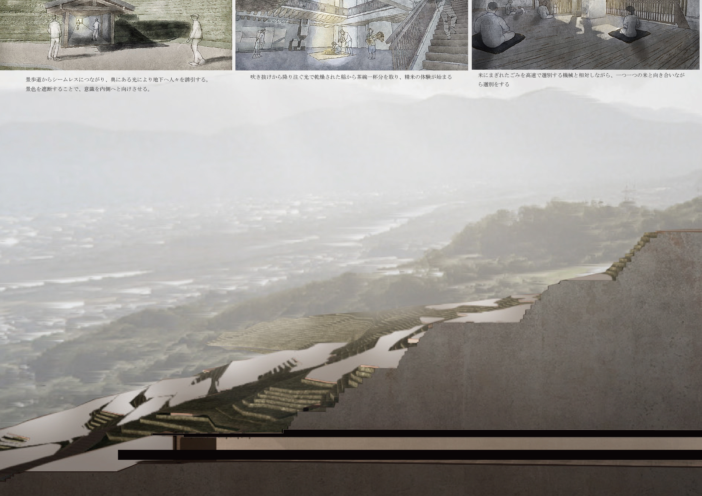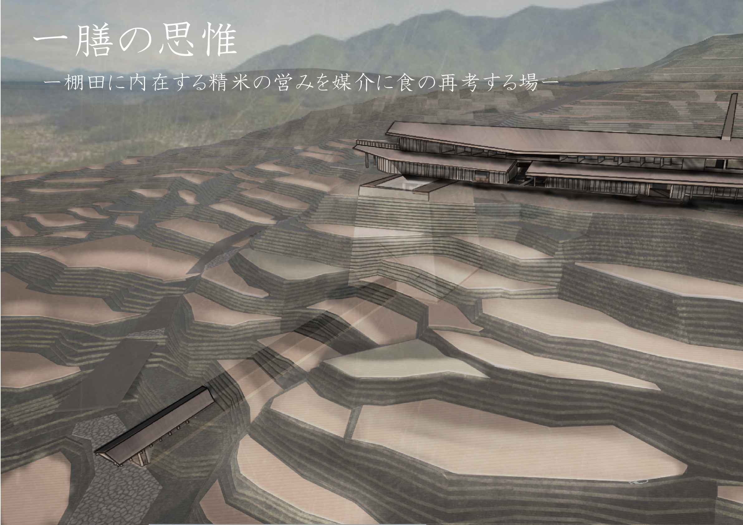本計画は、棚田という食の原風景の中に精米施設と滞在拠点を重ね合わせることで、一膳の米に至るまでの過程を身体的に捉え直す建築である。棚田の地下には精米工程を内包した施設を配置し、籾が白米へと変化していくプロセスを、地形に沿って下から上へと連続的に体験できる構成とした。来訪者は機械による大量精米の動線と並行して、一膳分の籾を携え、かつて用いられてきた手作業の精米を行いながら上昇する。その過程で、機械化によって不可視化されてきた食に要する労力や時間、身体への負荷を自身の感覚として知る。地上には食事や滞在の場を設け、棚田の風景の中でその体験を咀嚼し、内省へとつなげる。生産・加工・消費が分断された現代に対し、本建築はそれらを一続きの空間として再編し、一膳の背後に潜む労と時間を思惟する契機を生み出すことを目指す。