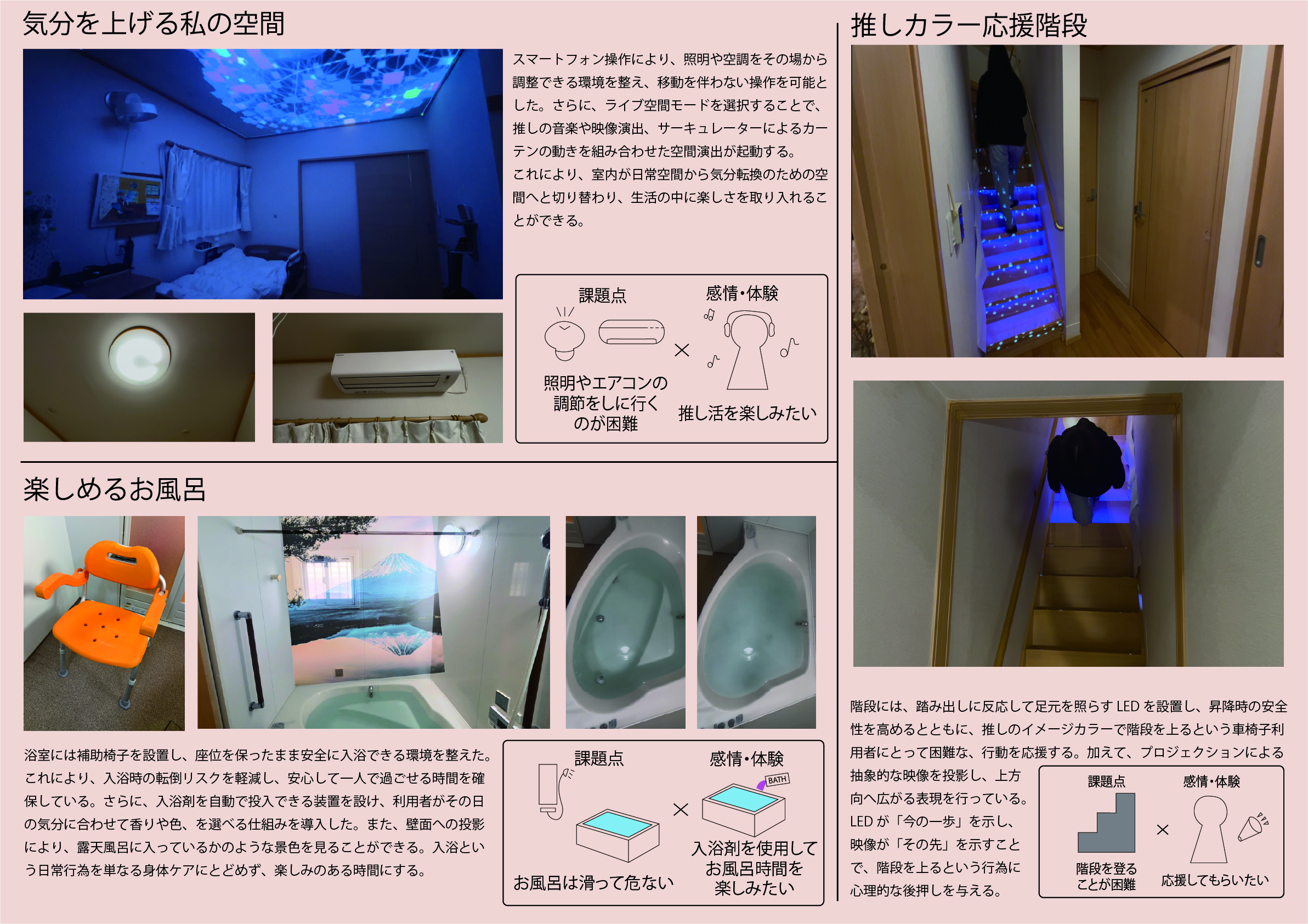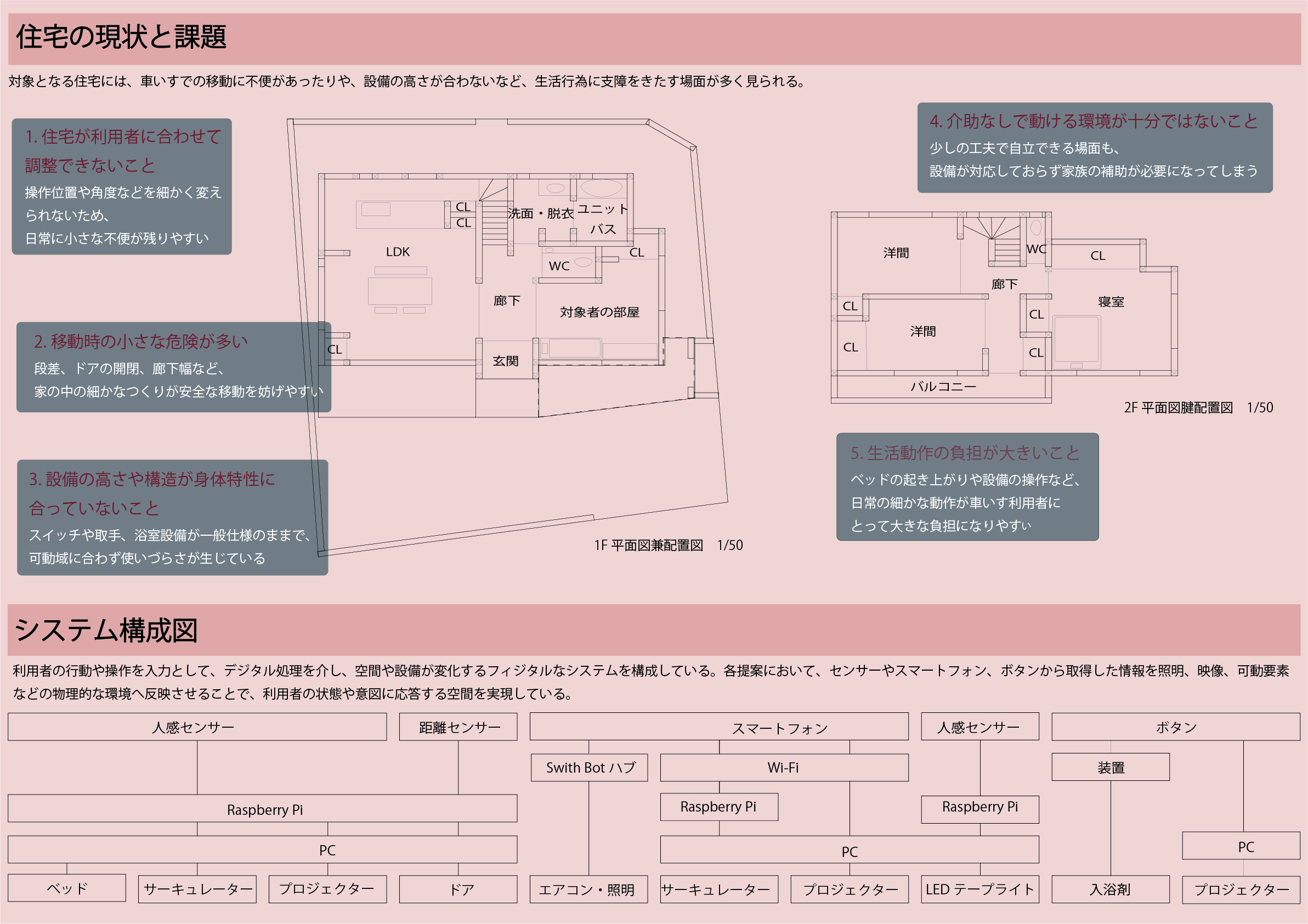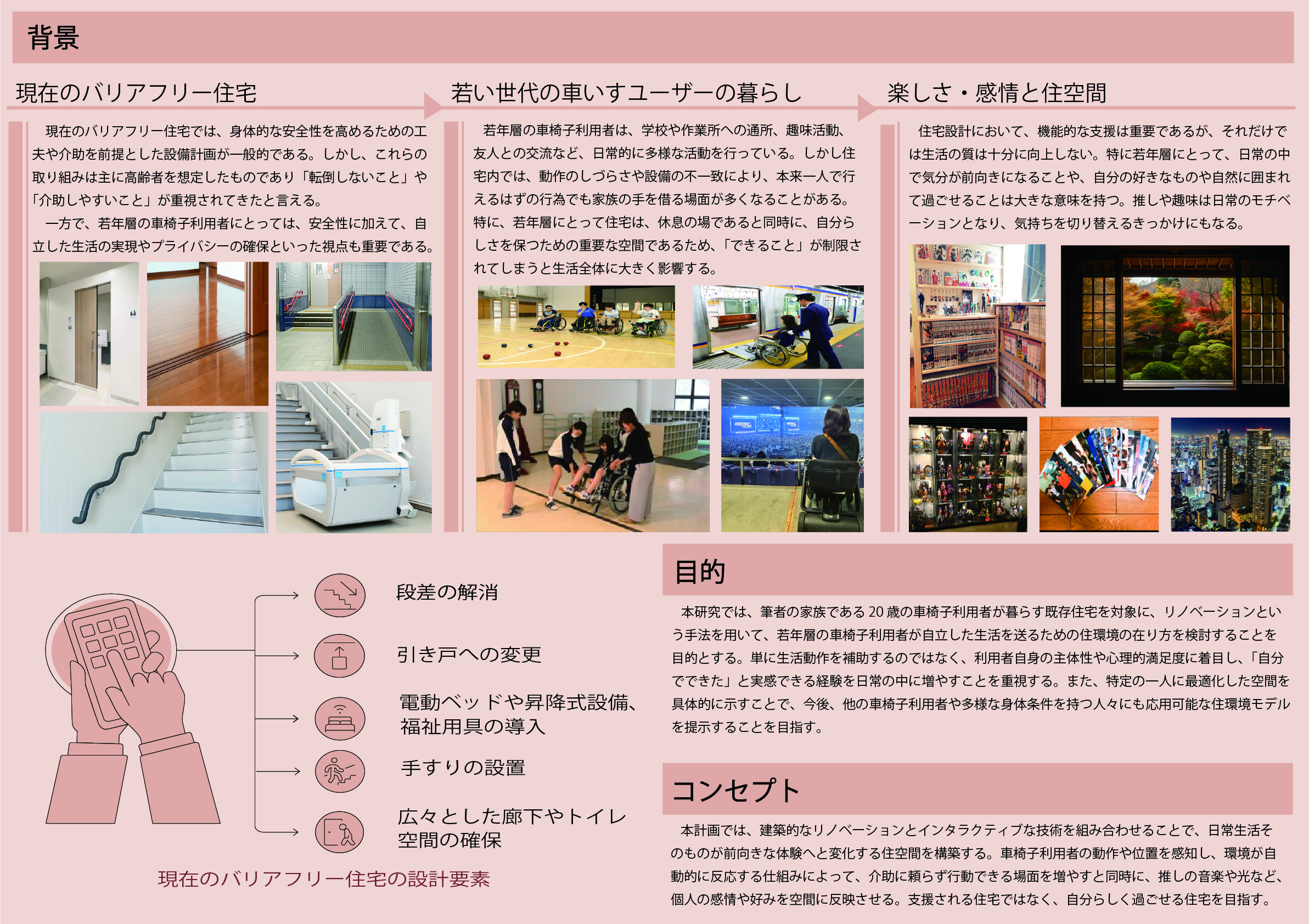 朝、ベッドから起き上がり、部屋を出て、階段を上り、お風呂に入る。こうした何気ない日常の行為は、車椅子利用者にとっては一つひとつが選択と準備を伴う動作であり、時に気持ちを消耗させる場面でもある。特に若年層にとって住宅は、身体を休める場所であると同時に、自分らしさを保ち、前向きな気持ちを取り戻すための大切な空間である。本卒業設計は、20歳の車椅子利用者が暮らす既存住宅を舞台に、日常生活の中で繰り返される5つの場面に着目し、身体的な支援と個人の感情に寄り添うパーソナル空間の在り方を描く。住宅を「支援される場所」ではなく、「前向きになれる場所」として再構成することを目指している。この物語は一人のための住まいであると同時に、誰もが自分のペースで暮らすための住環境の可能性を示すものである。