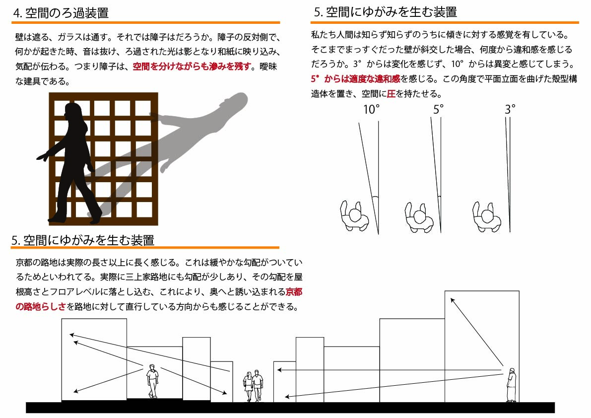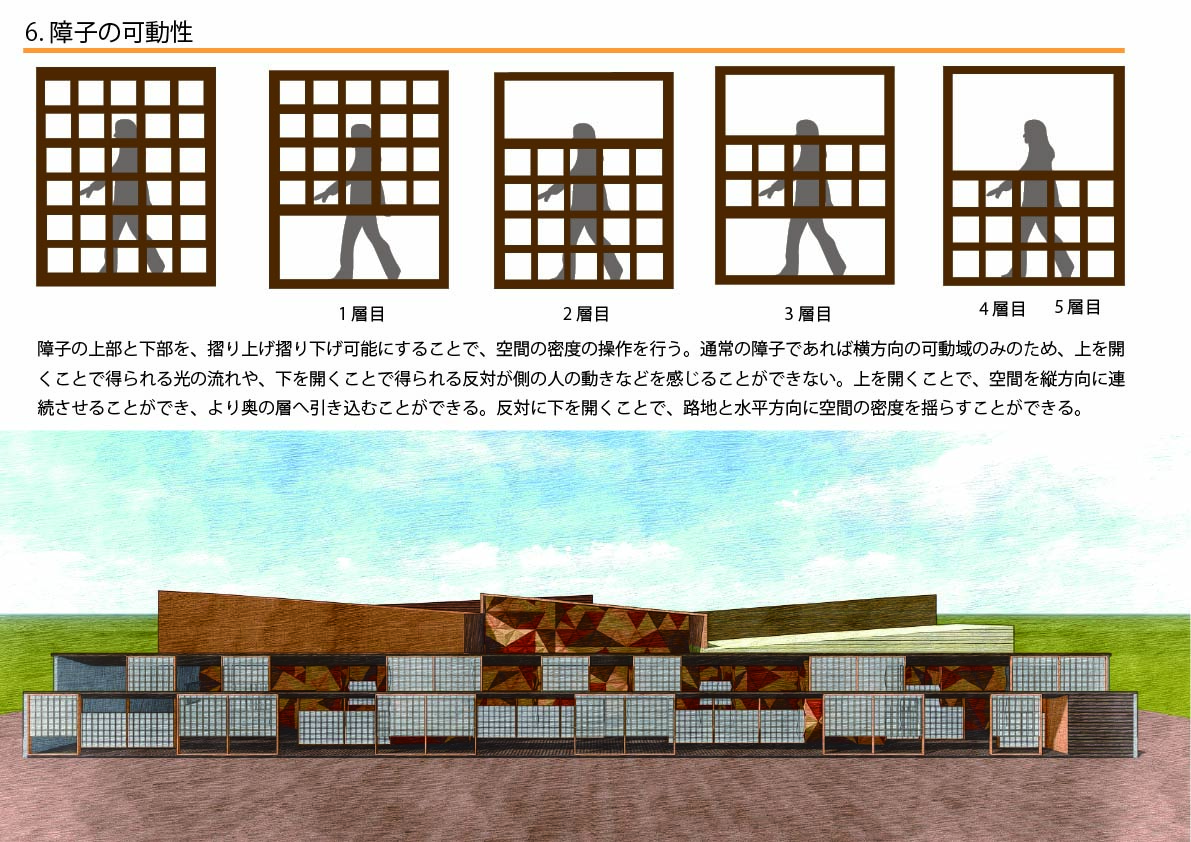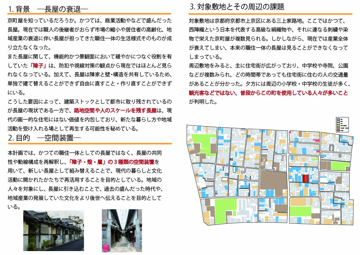 本提案は、京都の路地に面している空き長屋の再生を目標とした。「路地×障子×殻×層」の操作で空間密度に変化を与える。