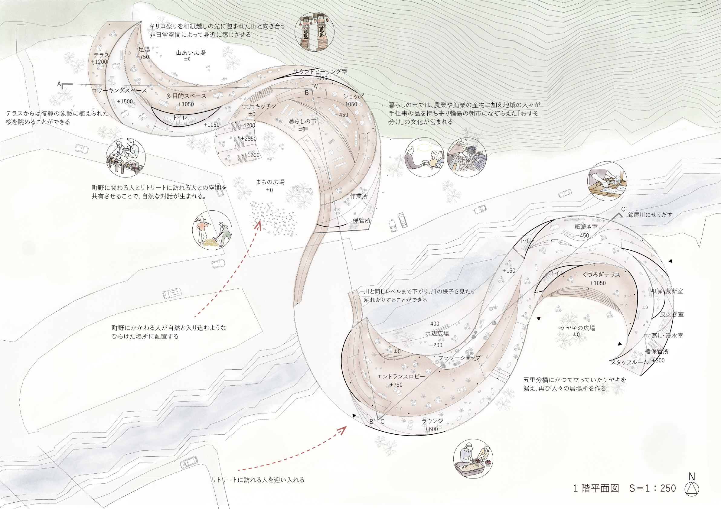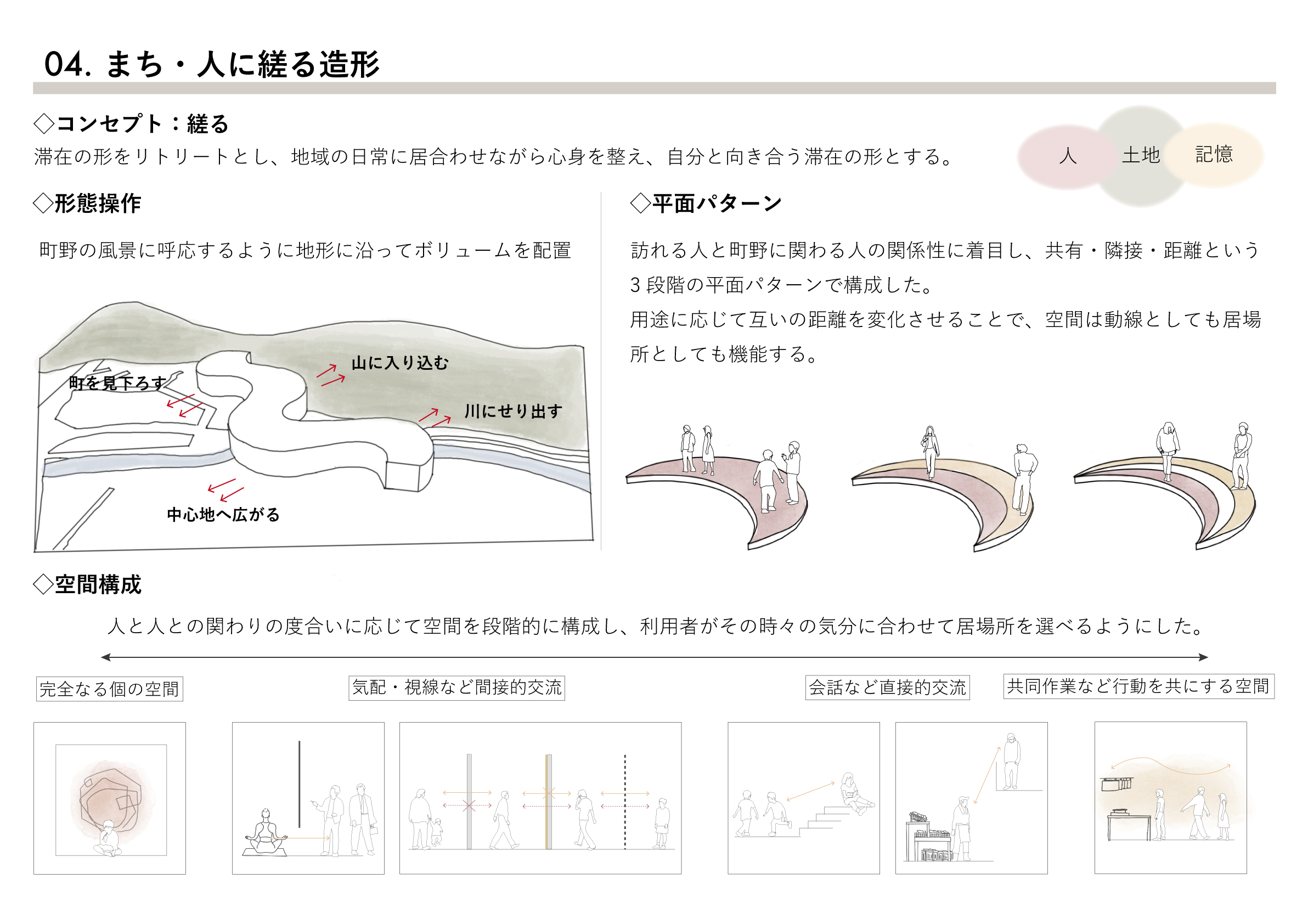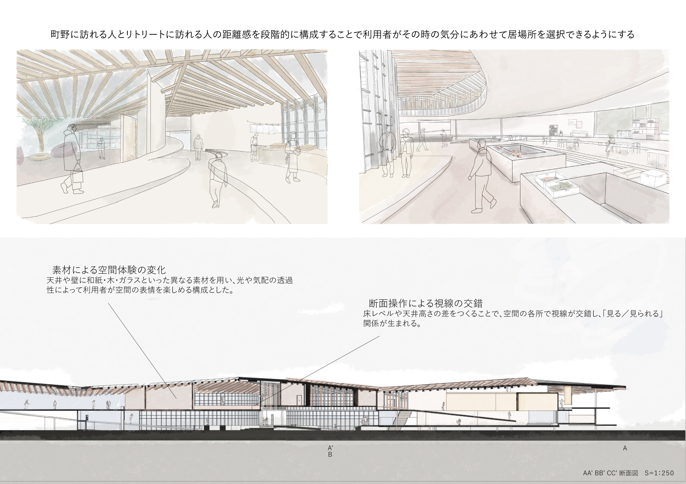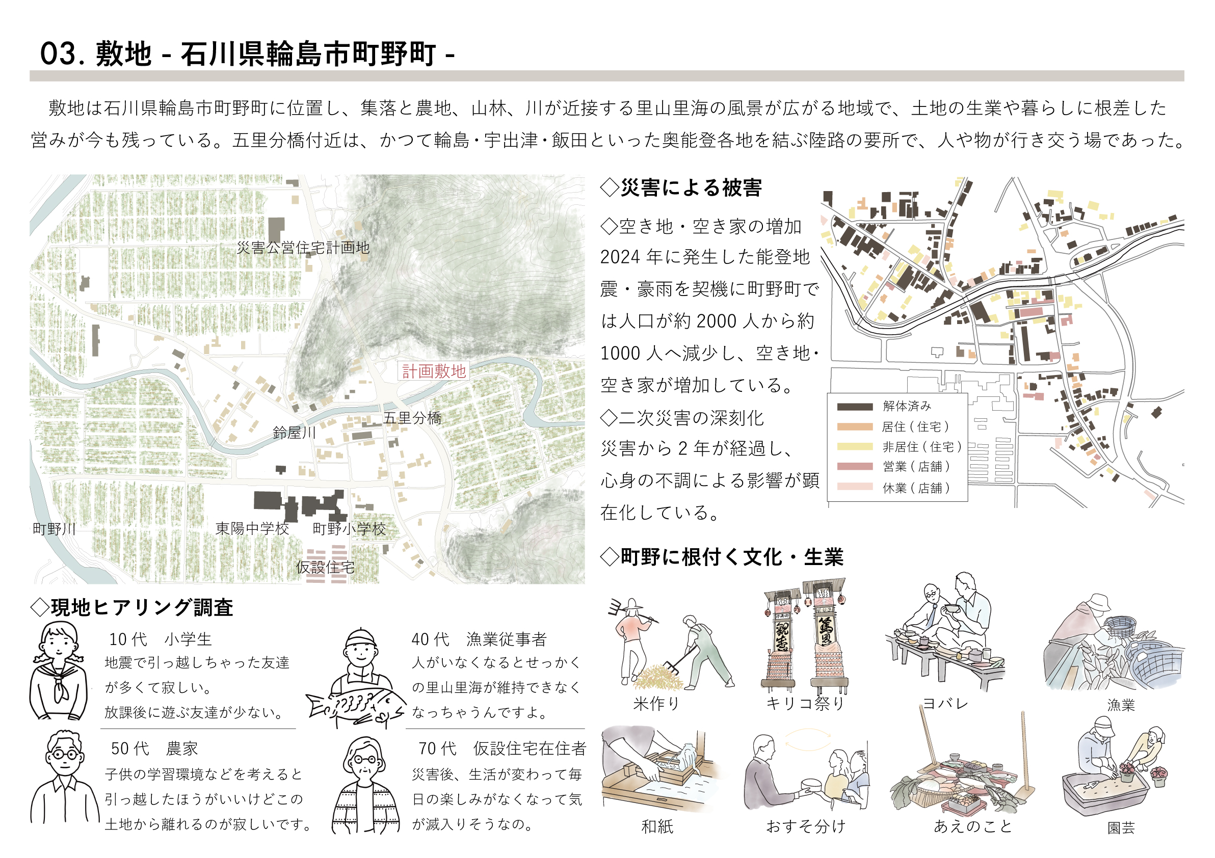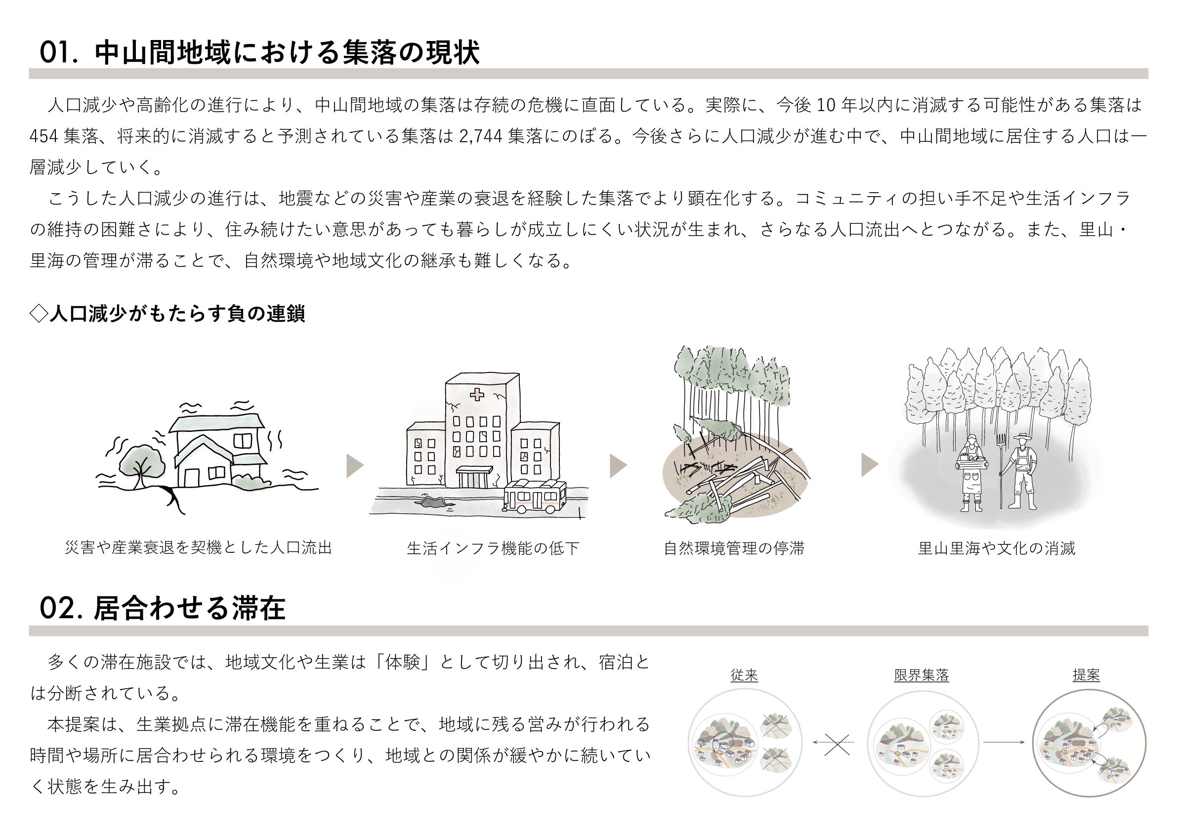 町野町に残る農や和紙、祭礼準備といった生業の場に滞在を重ねることで、人は働く時間の気配や支度の音、何気ない会話に立ち会う。住むことが難しくなった土地であっても、そうした関わりが積み重なることで、人と地域との関係は途切れずに続いていく。滞在を通して営みに身を置き、関係が緩やかに更新されていく在り方を、この建築は受け止める。