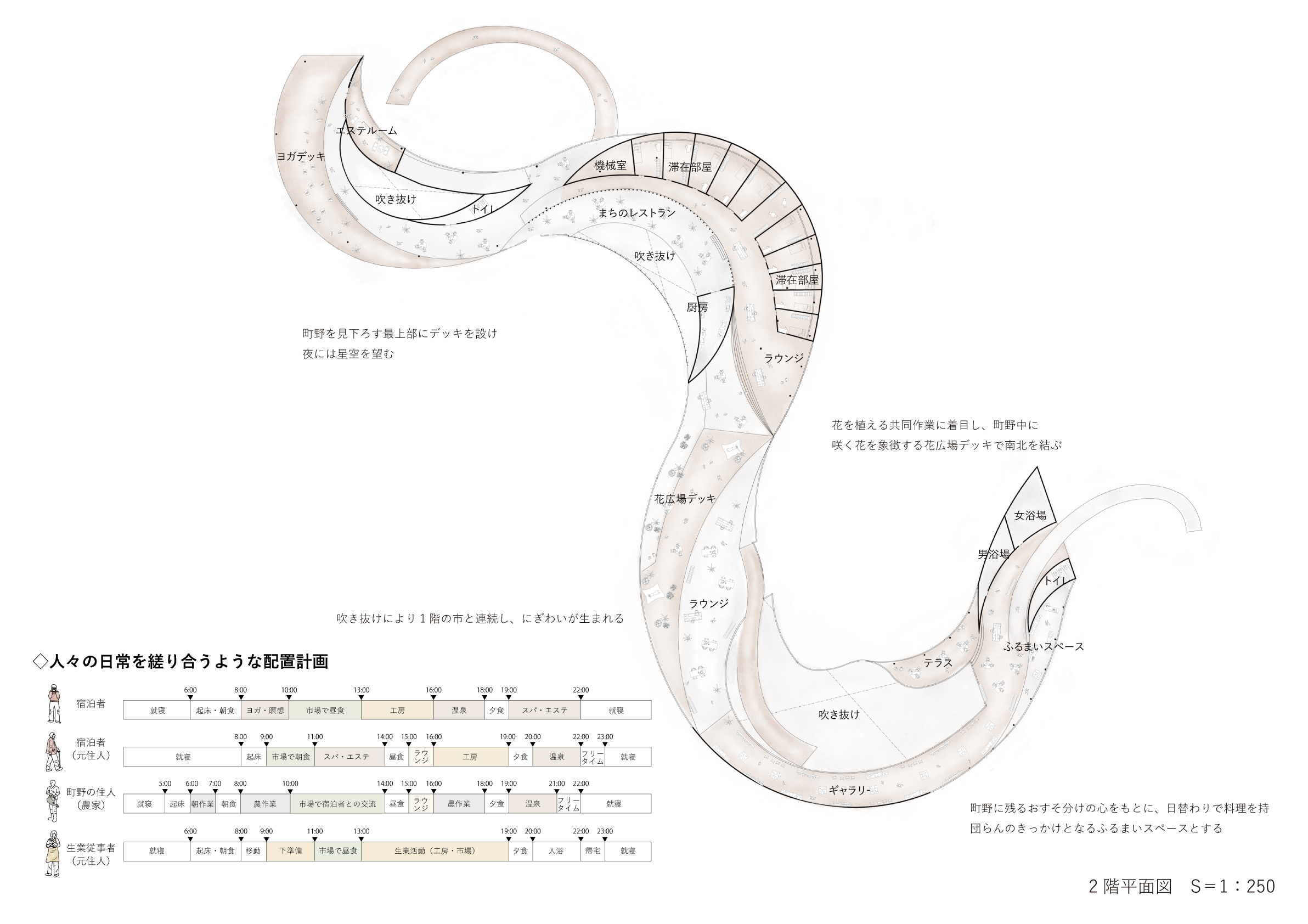 By layering spaces for stay onto sites of ongoing livelihoods—such as farming, washi-making, and preparations for local festivals in Machino—people come into contact with the rhythms of work, moments of preparation, and ordinary conversations. Even in places where permanent residence has become difficult, these accumulated encounters allow relationships between people and the region to persist. This architecture receives and sustains a way of staying in which engagement with daily practices gently renews connections over time.
