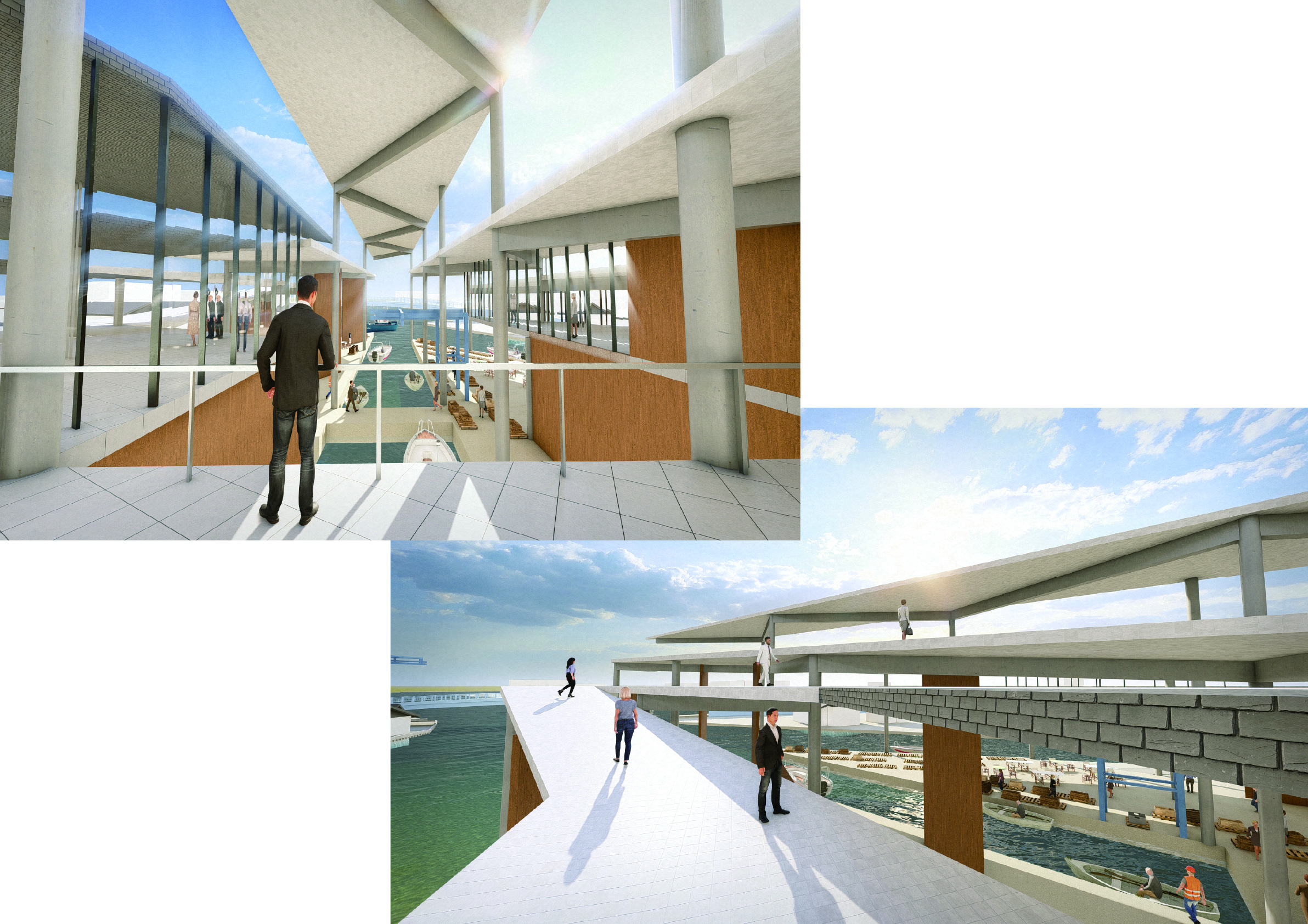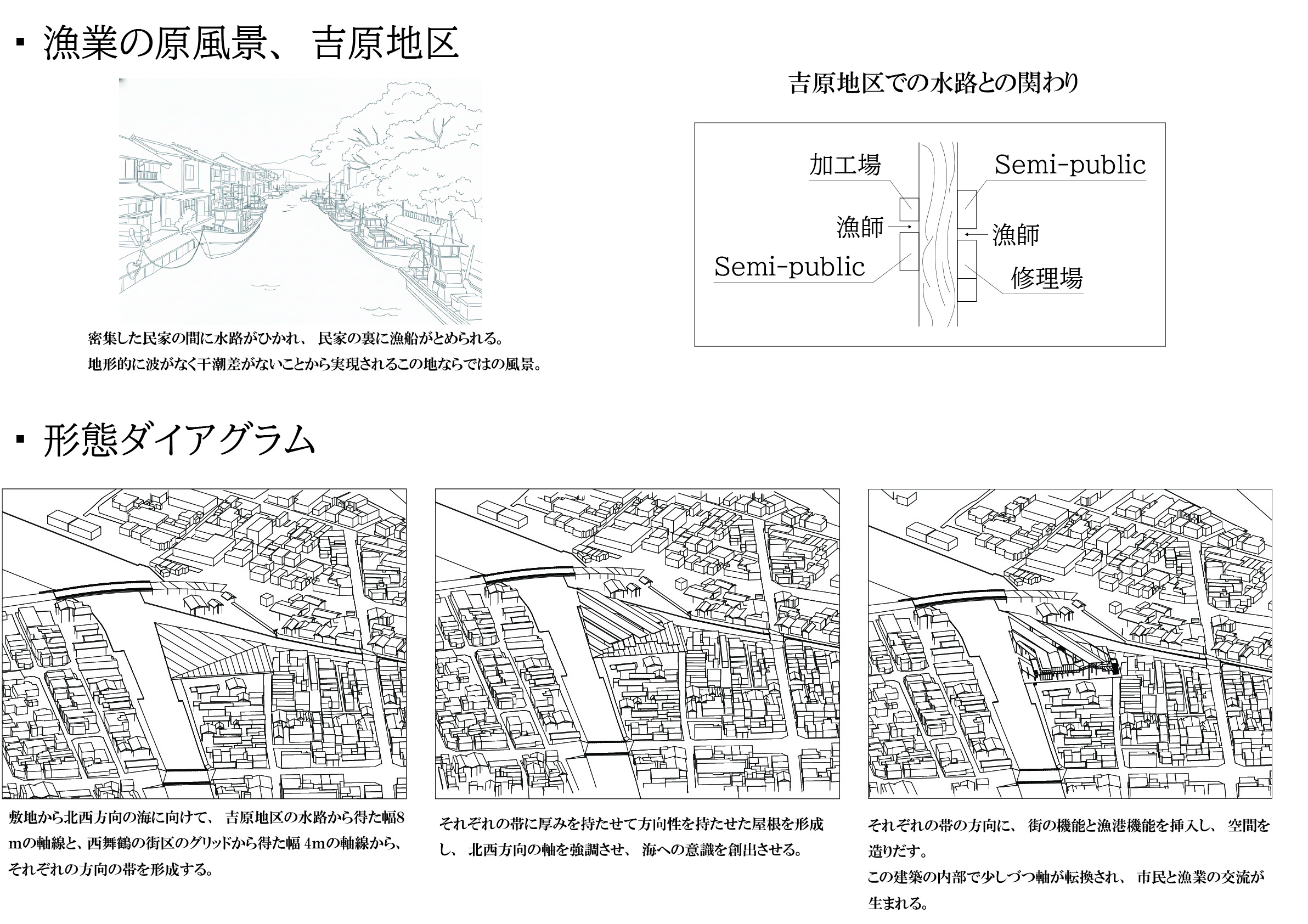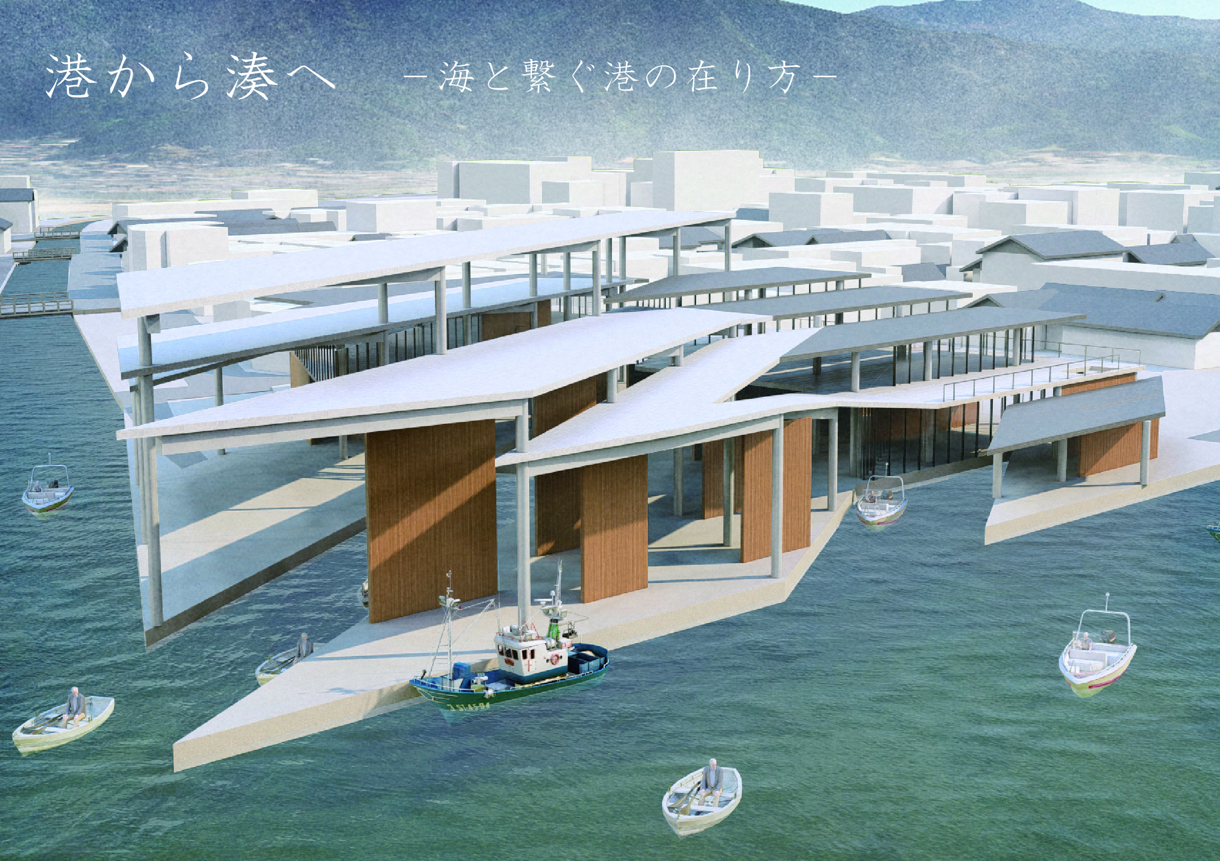 古くより港町として漁業で栄えた舞鶴。しかし近代化により海岸は埋め立てられ、コンテナ船の発着するふ頭へと変わり、海と分断されこの地の生業である漁業は衰退をたどる。そんな街と海を再び繋ぐ漁港を提案する。