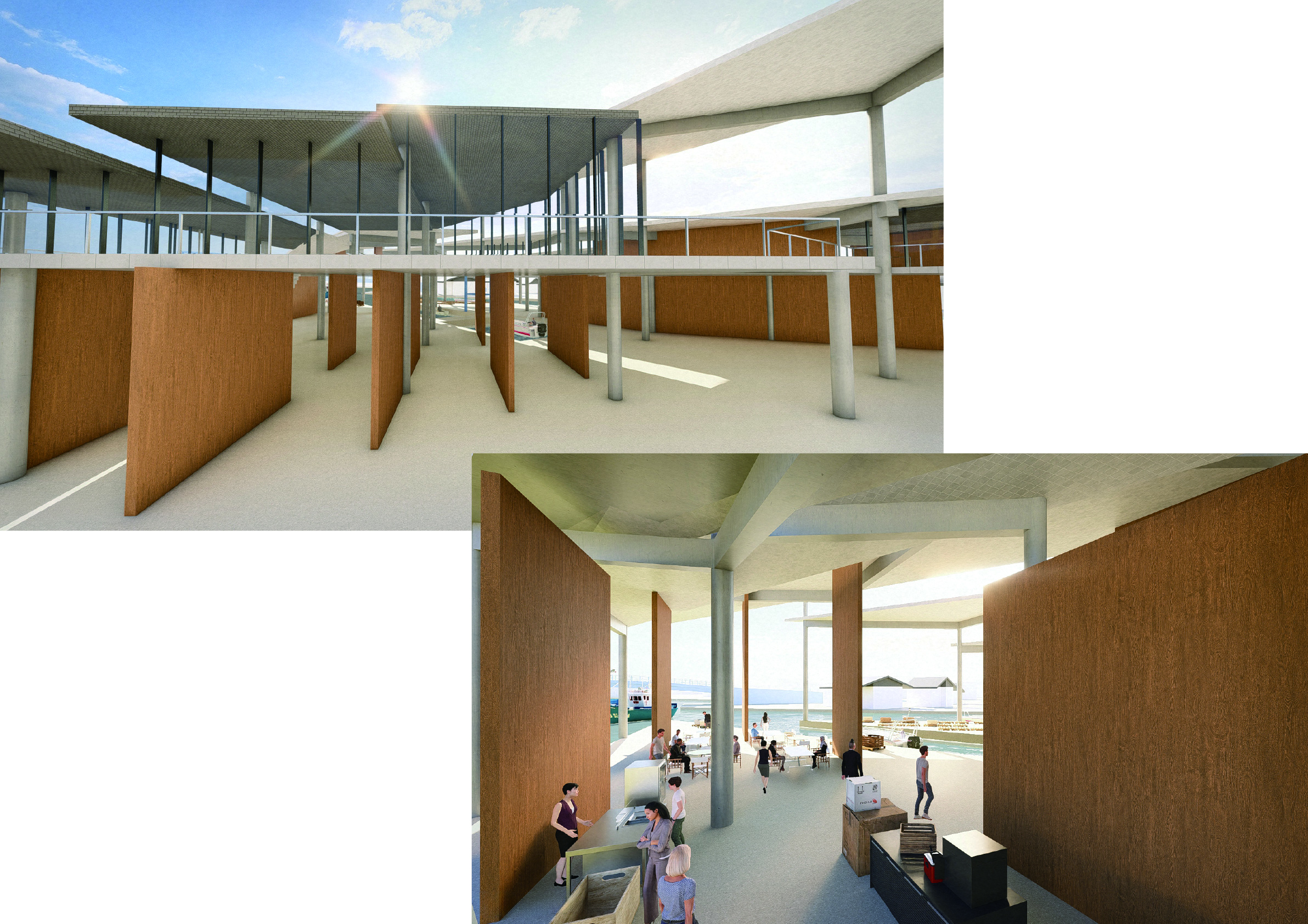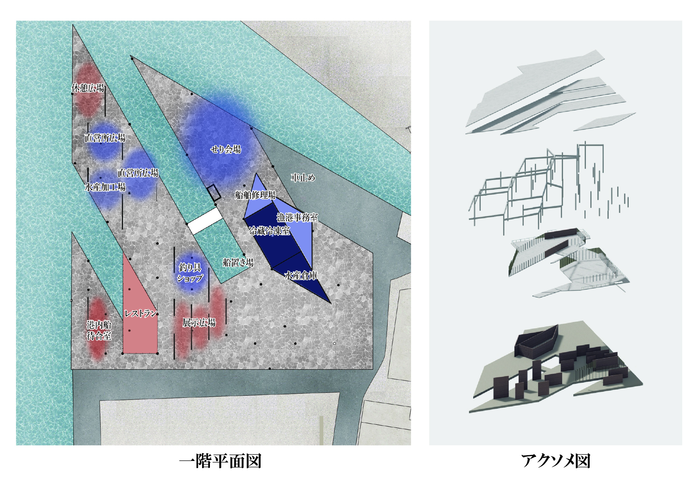 Maizuru has long prospered as a port town through its fishing industry. However, with modernization, the coast has been reclaimed and turned into a wharf for container ships, cutting the town off from the sea and causing the fishing industry, which was the town's livelihood, to decline. We propose a fishing port that will reconnect the town with the sea.